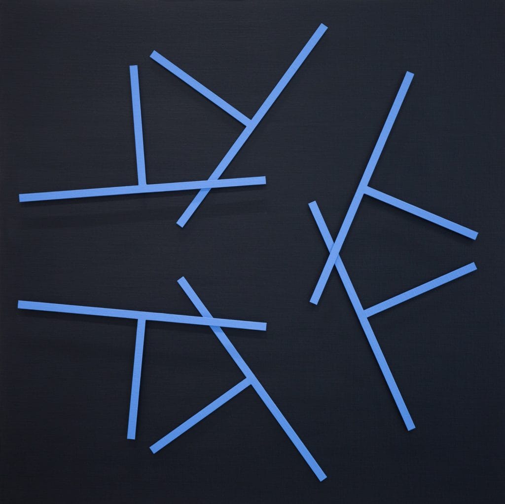 Réalisée dans des tons bleus, Dynamic Structure 61114 B se constitue d’une toile recouverte de six éléments en forme de T d’un bleu cobalt vif, qui effectuent des rotations sur un fond bleu marine. Le mouvement fluide de la composition, rehaussé par l’utilisation remarquable de la couleur, évoque le principe d’un kaléidoscope version géante, sur une toile de 120 cm². Le temps semble s’arrêter lorsque l’on observe les motifs géométriques infinis se former sur cette œuvre.