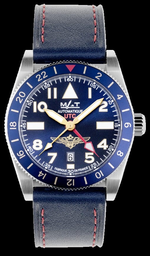 Montre « UTC NAVAL AVIATOR » Boîtier 42.5mm en acier, cadran bleu nuit soleillé, index et chiffres arabes en Super Luminova BGW9 (Blue Glow White). Edition développée en collaboration avec les pilotes de l’Aéronavale américaine et limitée à 150 pièces.