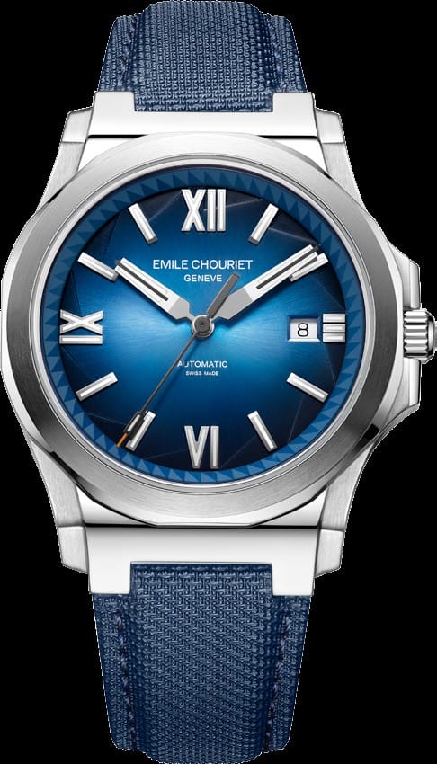 Montre -bracele T « Ice Cliff » Boîtier 40mm en acier, cadran bleu avec index romains / indices, mouvement automatique Calibre EC9316, étanche à 5 atm, bracelet tissu avec boucle déployante.