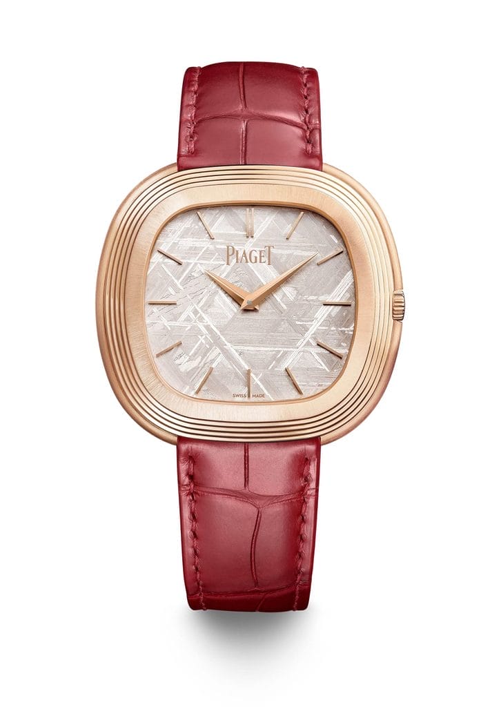 Ce modèle s’intègre parfaitement aux nouvelles créations de la Maison, aux côtés des versions en météorite blanche ou verte présentées lors du salon Watches & Wonders. Tandis que la météorite verte contraste avec un boîtier en or blanc, la blanche, aux motifs géométriques, s’adoucit au contact de l’or rose.