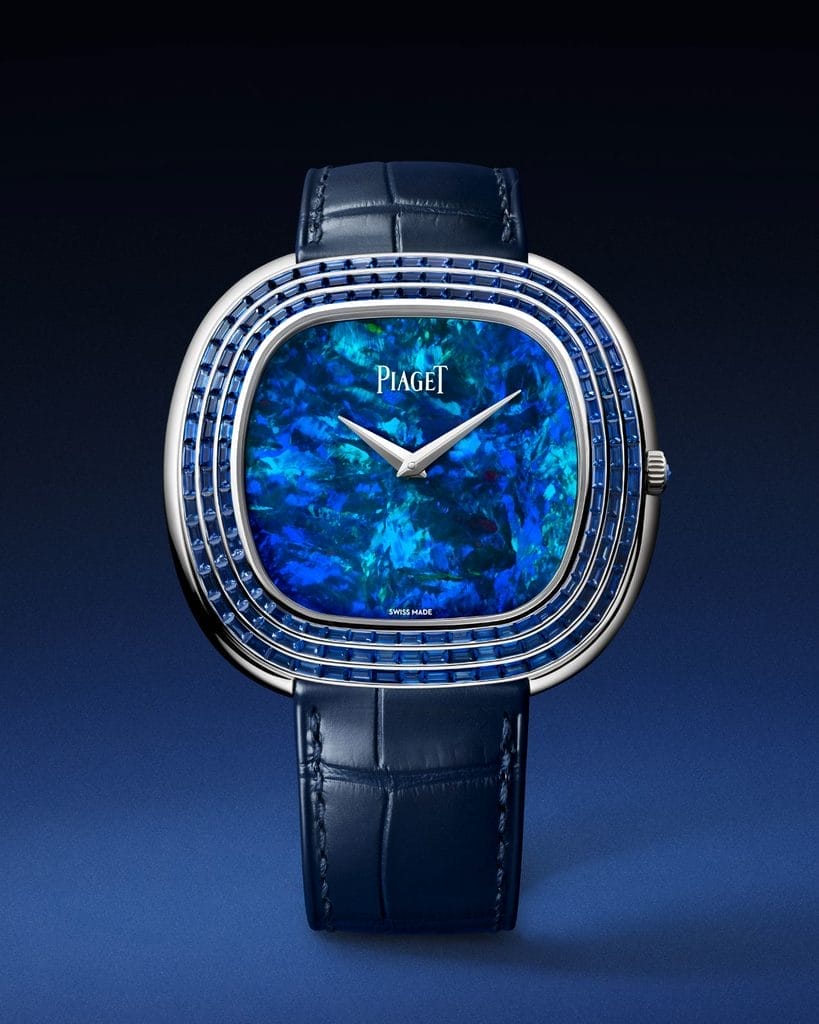L’opale, pierre précieuse d’une rare intensité, se déploie sur l’ensemble du cadran dans des nuances vibrantes de bleu et de vert. Ce spécimen, d’une dimension exceptionnelle, capte la lumière avec une subtilité inégalée. Entouré d’un triple rang de saphirs baguette, sélectionnés pour leur éclat bleu homogène, le cadran se pare d’un éclat digne des plus grandes œuvres. Yves Piaget disait : « Pour moi, le monde est comme une opale ; il est composé d’une myriade de goûts et de couleurs. » Une philosophie qui trouve ici son expression la plus raffinée.