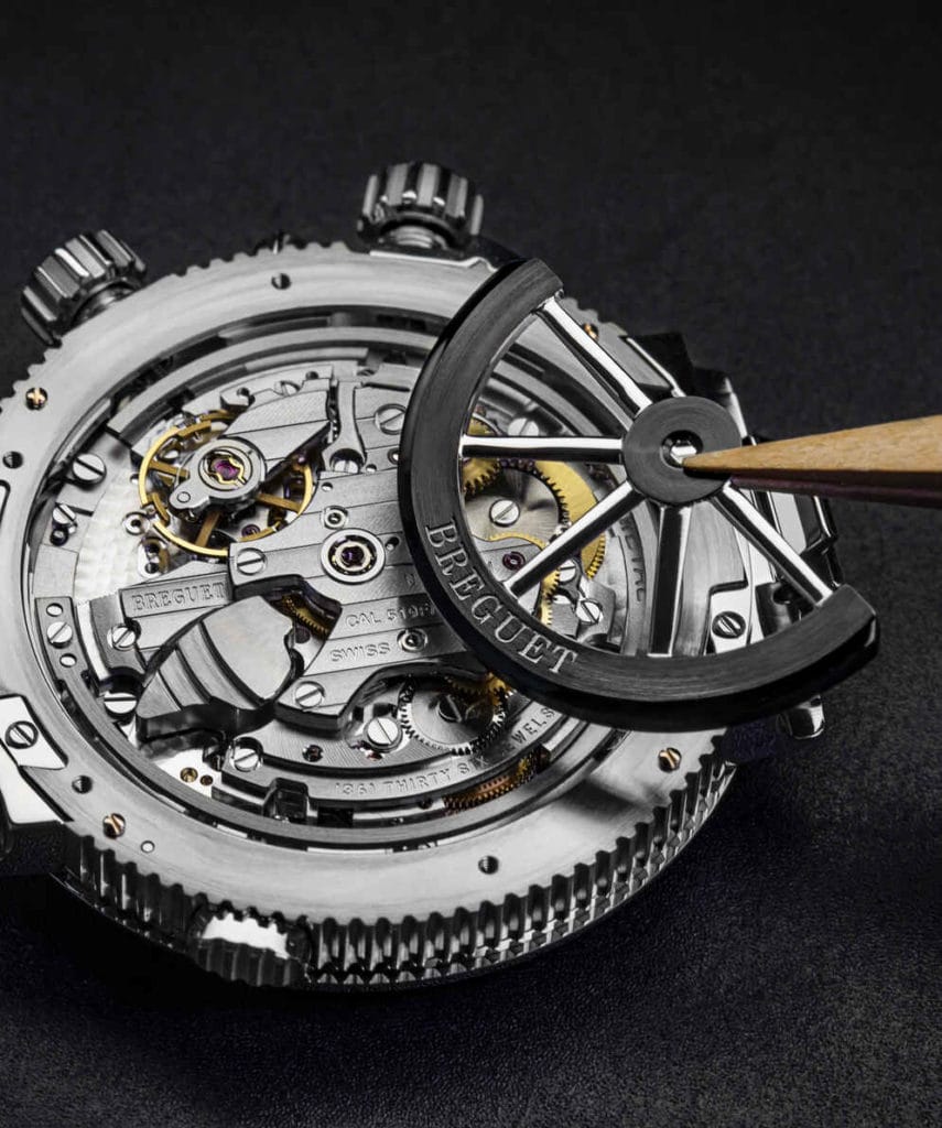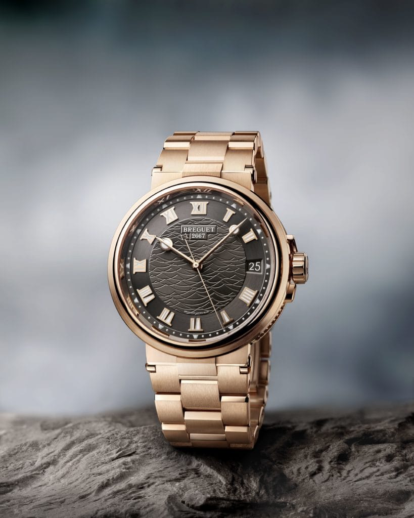 Les déclinaisons en or rose des modèles Marine accueillent quant à elles un type de guillochage spécialement conçu pour la collection qui reflète son inspiration. Le cadran en or, tel le hublot d’un bateau laissant apercevoir la mer en mouvement, accueille un guillochage en forme de « vagues ». Ce métier d’art, qui a de tout temps sublimé les garde-temps Breguet, donne un supplément d’âme à ces pièces, grâce à l’expertise d’artisans guillocheurs formés au sein de la Maison. Mettant en valeur les différentes indications du cadran et extrêmement complexe dans sa réalisation, le guillochage se décline ici dans des notes ardoises, offrant un joli contraste avec la profondeur de l’or rose.