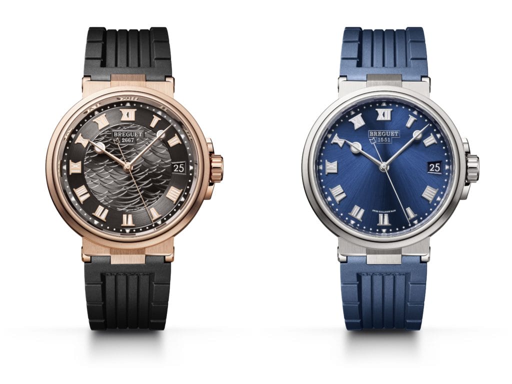 La collection Marine symbolise l’esprit d’aventure et de conquête. Elle s’inspire des garde-temps d’autrefois qui endossaient le rôle d’instruments scientifiques et servaient notamment à la navigation en mer. En 2021, Breguet complète cette ligne avec de nouvelles déclinaisons en or rose avec un cadran couleur ardoise et en titane avec un cadran bleu.
