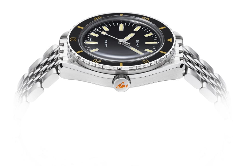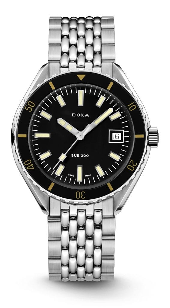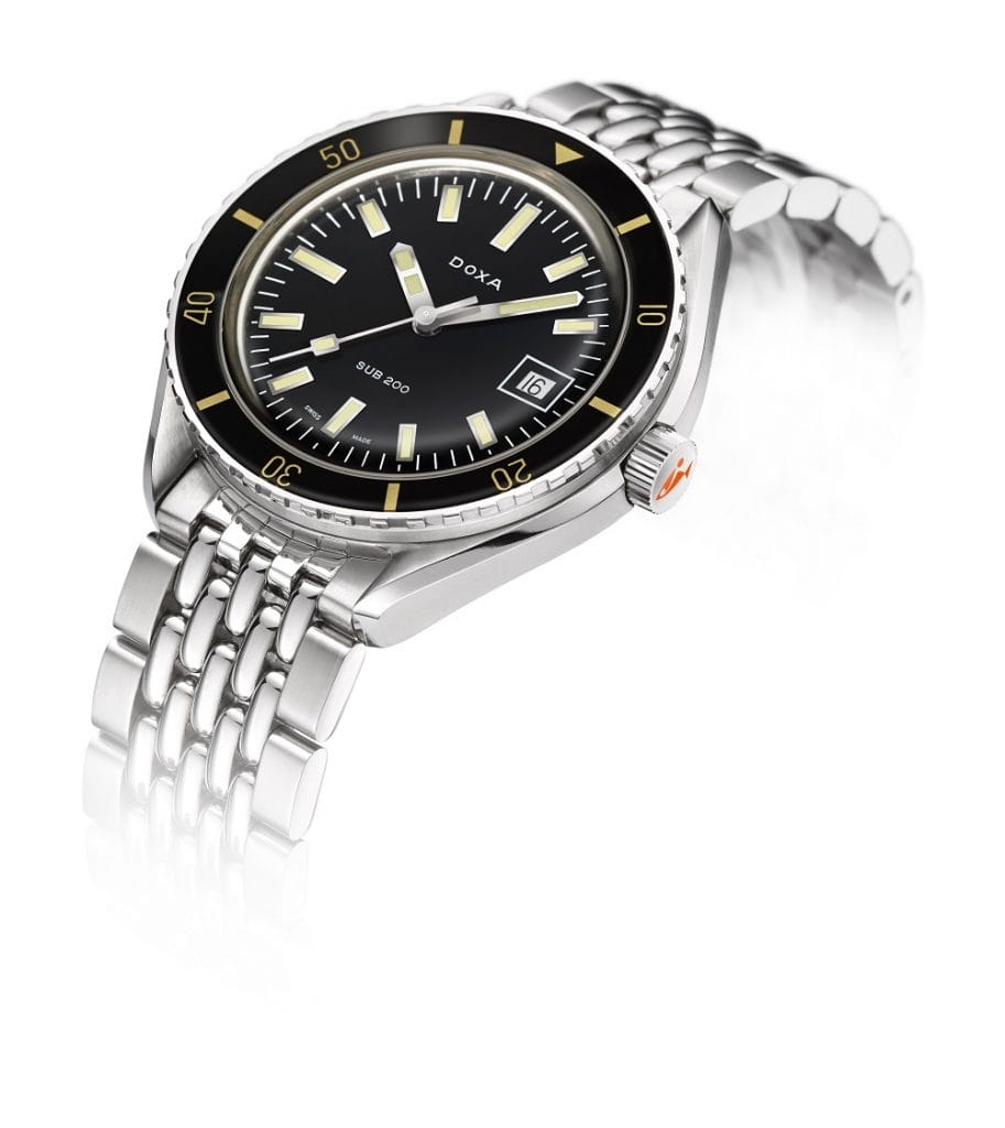 Lors de la dernière édition de Baselworld, DOXA a présenté une réédition de la fameuse DOXA SUB 200 en acier, pour célébrer le 130ème anniversaire de la marque. Tout comme le modèle original créé en 1967 dont le concept baptisé SUB a représenté une révolution car elle était considérée comme une des premières montres de plongée professionnelle véritablement « grand public ». Etanche à 300 mètres et incluant pour la première fois une lunette tournante brevetée permettant de lire la table officielle des paliers de décompression, cette montre est devenue avec le fil des années une légende facilement reconnaissable car elle présentait aussi pour la première fois un cadran orange pour une montre de plongée, contrastant avec les cadrans traditionnels noirs ou blancs de l’époque.