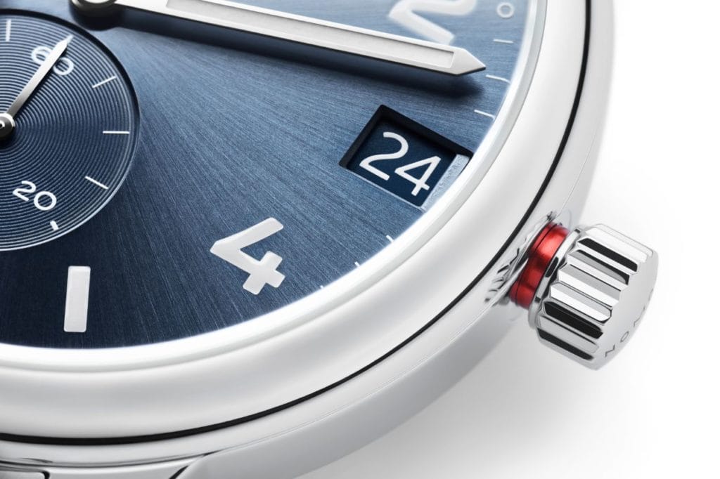 Le mouvement n’est autre que le calibre à quantième DUW 6101 breveté et déjà connu de la série neomatik de NOMOS Glashütte. Il est doté d’une correction rapide de la date dans les deux sens, avec une période de commutation extra-courte et un rotor très efficace qui se règle des deux côtés.