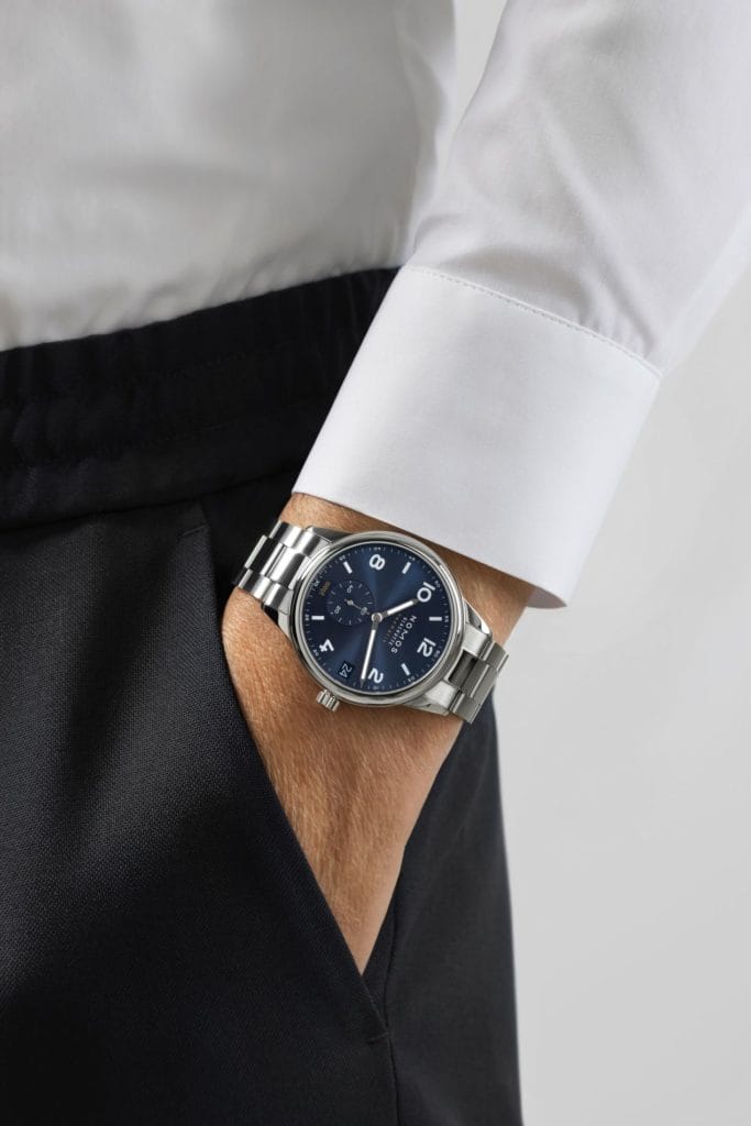 La particularité de cette nouvelle venue n’est pas seulement la finition soleil qu’arbore son cadran, ni uniquement sa couleur élégante et puissante, mais aussi son nouveau bracelet en acier inoxydable. Ce dernier a été pensé sur mesure pour la montre : un bracelet sportif à maillons équipé d’une boucle déployante avec barre de sécurité. Il s’adapte parfaitement au boîtier de la montre. Le bracelet et la tête de montre semblent inséparables, ne formant qu’un seul et unique objet.