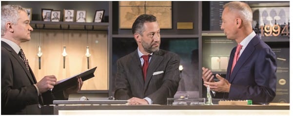 Piers Gibbon présentateur (à gauche), Aurel Bacs commissaire priseur en charge du département horloger de Philipps (au centre) et Wilhelm Schmid (à droite) CEO de Lange au SIHH 2018.