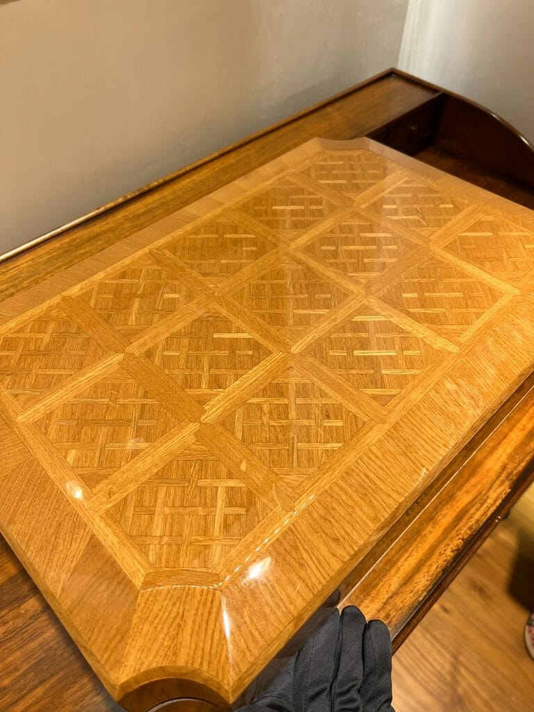 Détails de l’écrin réalisé dans le chêne de Versailles : les parties extérieures de l’écrin reproduisent un parquet dit « Versailles ». A l’intérieur de l’écrin un magnifique travail de marqueterie reproduit une partie du tableau d’Elisabeth Vigée Le Brun « Marie-Antoinette à la rose ».