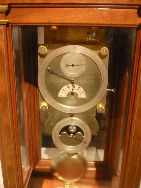 Dans un coin une pendule de Robert Robin m’interpelle. Je fais constater à un commissaire que celle-ci a un petit problème. Car de son porte-échappement pend au bout de son spiral, qui n’en n’est plus un, le petit balancier qui a son axe brisé. Ce monsieur disparaît aussitôt… Malgré cela son échappement est curieux et semble de type Duplex ou à ancre avec une roue double. Un autre régulateur de Robin avait sa porte avant cassée et se trouvait à côté. Le pauvre Robert Robin, ce n’est pas son jour…
