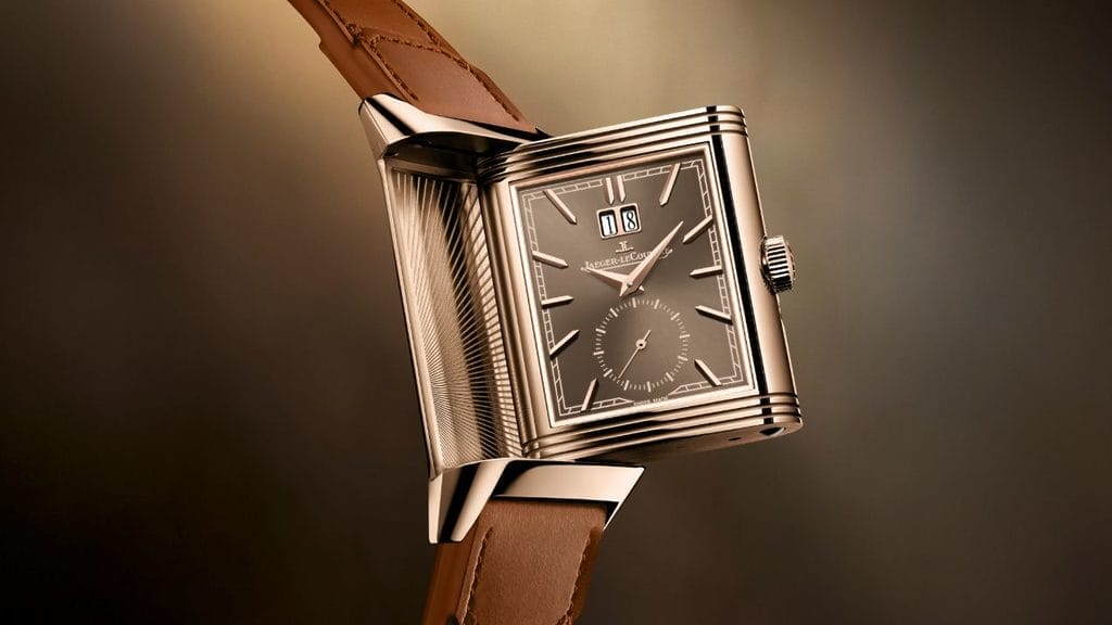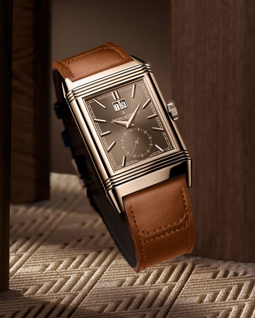 Le recto de la montre, élégant et épuré, présente une finition soleillée – bleu profond pour la version acier, chocolat pour la version or rose – soulignée par une grande date encadrée de métal poli et une petite seconde circulaire. À lui seul, il incarne déjà l’esprit raffiné de la Reverso Tribute.