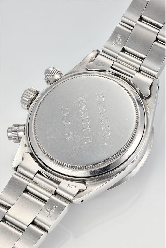 Sur le fond du boîtier, une gravure rappelle cet exploit : “DIE TO DRIVE – RENAULT F1 – J.P.J. 79”. Elle symbolise un moment de fierté nationale, aussi bien pour la marque que pour l’homme, reconnu comme l’un des pionniers de l’ère du moteur turbocompressé.