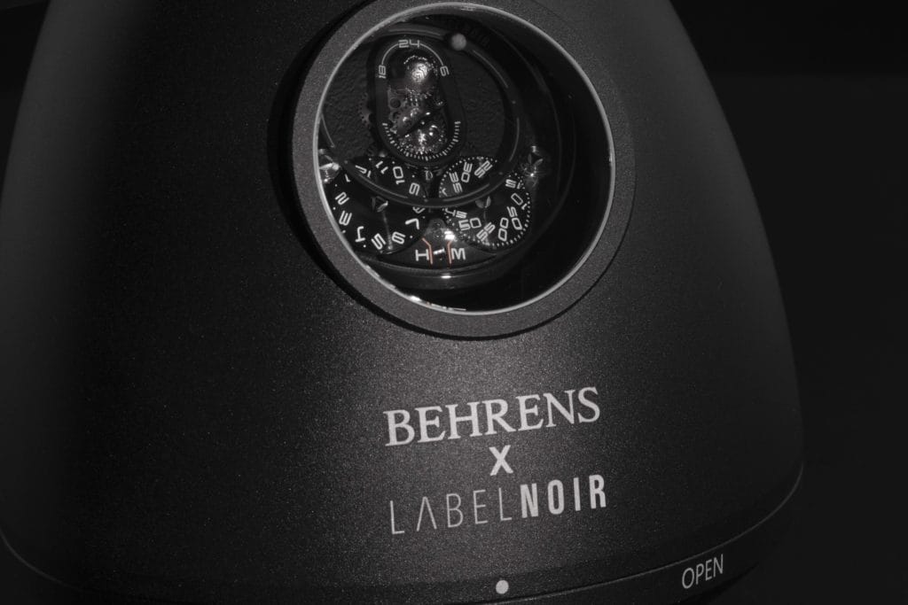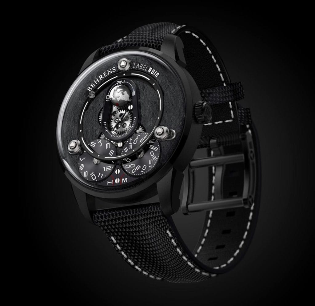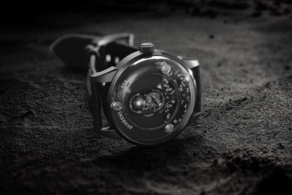 C’est justement avec cette ambition que depuis 10 ans Behrens l’hongkongaise se libère des conventions et s’illustre parmi les plus grands. Sa singularité : modifier ses propres mouvements par la construction de modules mécaniques internes offrant un affichage tout à la fois fonctionnel et varié. Nommée au GPHG 2020, la montre Apolar illustre cette quête d’innovation constante conjuguée à l’art de la différence. Modèle mécanique entièrement élaboré « in house », Apolar puise son inspiration dans la relation orbitale entre Terre et Lune. Émanation céleste au design unique qui ne pouvait qu’enchanter Label Noir pour y apposer sa griffe, réécrire sa destinée. Cinquième collaboration avec une marque horlogère, l’Apolar Dark Moon inscrit un nouveau chapitre dans l’histoire du co-branding de Label Noir. Un système qui permet à l’horloger genevois de sublimer le génie inventif, magnifier la matière, et d’apposer le sceau de son expérience. Luxe créatif et décalé, garde-temps hors normes et métamorphosés.