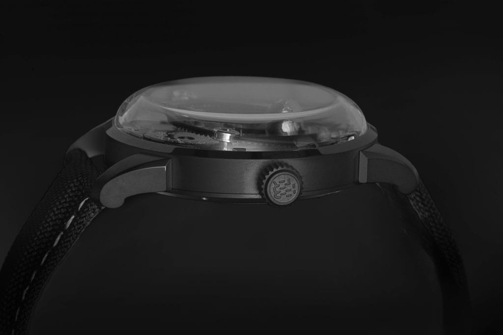 Mais pour ce qui est du mécanisme, cette pièce, en édition limitée à 50 exemplaires présentée sur un bracelet tissu noir aux surpiqures blanches, affiche toutes les caractéristiques initiales de l’Apolar B020. Un mouvement automatique ETA Cal.2824 de fabrication suisse, une réserve de marche de 42h, une fréquence de 28’800 alternances/heure et une étanchéité à 50m. Et puisque la marque s’est attachée à développer une démonstration inédite des mouvements célestes, le modèle Apolar offre une ligne d’horizon bien à lui. Un cristal saphir en forme de dôme, courbure terrestre source d’une nouvelle perspective pour les passionnés d’horlogerie attirés par le beau comme par le rare. Mais avant de ressentir la loi de l’attraction et de revêtir l’Apolar Dark Moon, il y a tout lieu de s’émerveiller devant l’ingéniosité créative de l’écrin. Un haut de capsule spatiale, noir, massif, éloquent ; et enfin, de sa lunette : plonger entre ciel et terre.