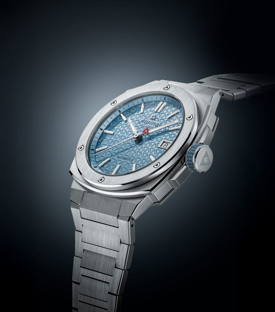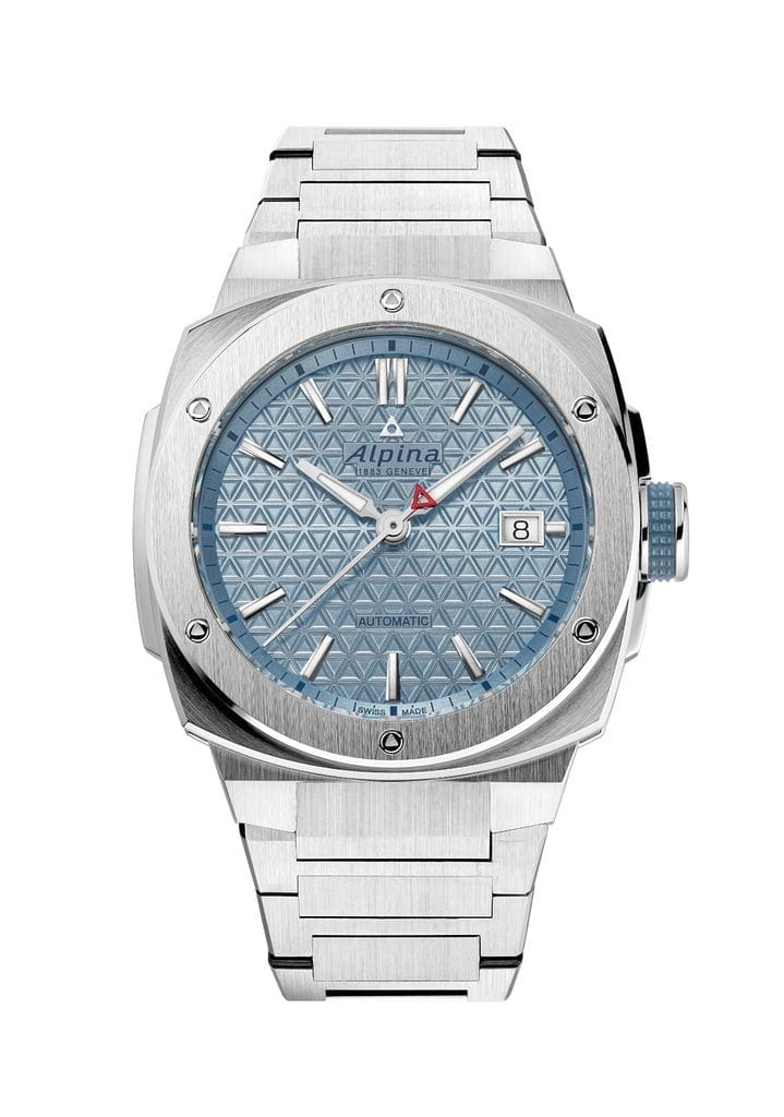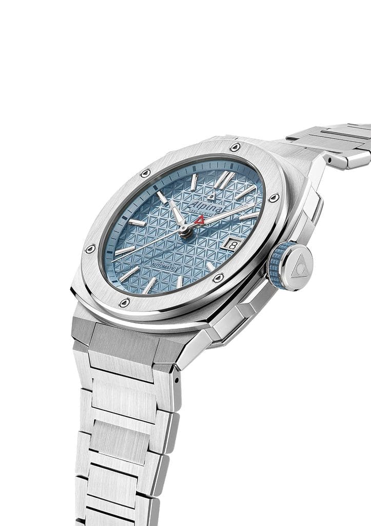 Logée dans un boîtier coussin en acier de 39 x 40,5 mm, cette montre affirme une élégance sportive à la fois discrète et sophistiquée. Au cœur de son design bat le calibre AL-525 à remontage automatique, offrant une réserve de marche de 38 heures. Son cadran, orné du motif triangulaire emblématique des cimes alpines et doté d’un guichet date à 3h, est parcouru par trois aiguilles précises.