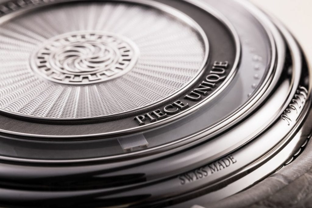 - Guillochage : Yann Von Kaenel a sublimé la surface de la montre avec un motif inspiré de la spirale de la pomme de pin, incarnant la beauté mathématique du Nombre d’Or et de la suite de Fibonacci. Chaque ligne guillochée capte la lumière et révèle des détails subtils, créant un décor vibrant et évolutif.