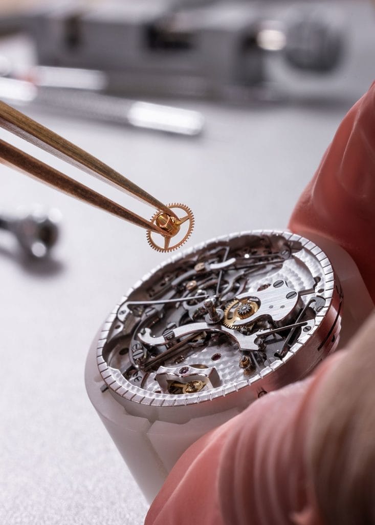 Le mécanisme de la répétition minute de L’Armoriale est un chef-d’œuvre de complexité, conçu pour offrir une expérience sonore de haute qualité. Les gongs de type « cathédrale », extra-longs et enserrant presque deux tours complets, prolongent la résonance de chaque son, offrant une tonalité profonde et riche, semblable à celle des grandes cloches de cathédrales. Chaque marteau frappe avec une précision millimétrique pour garantir une résonance optimale.