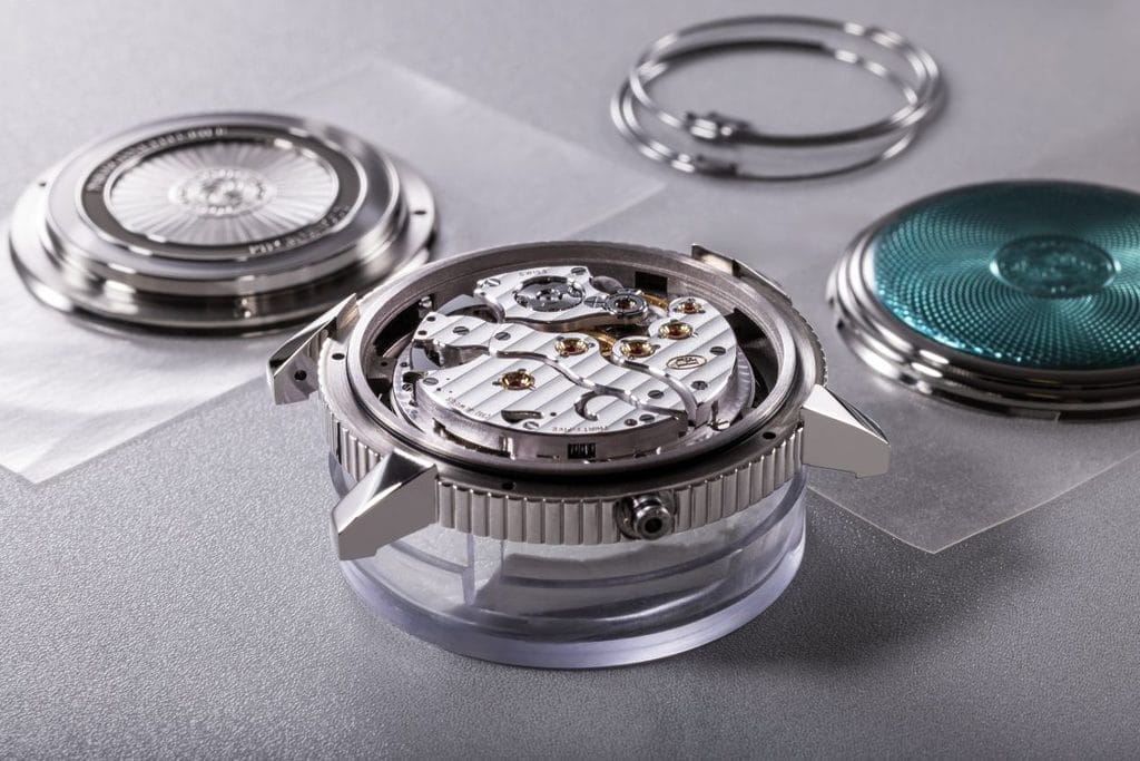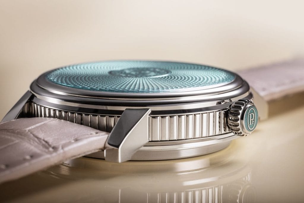 L’Armoriale cache son cadran, qui ne se révèle qu’en retournant la montre. La surface du boîtier, entièrement dédiée aux métiers d’art, présente un émail translucide grand feu vert pastel qui laisse entrevoir un motif guilloché délicat. Ce motif, inspiré de la pomme de pin, symbole de perfection et d’harmonie, incarne la suite de Fibonacci et le Nombre d’Or. Lorsque l’utilisateur retourne la montre, il découvre les aiguilles des heures et des minutes en or rose, discrètement positionnées sur le fond du boîtier. Ce cadran secret, orné de jade blanc du Guatemala, confère à la montre un caractère intime, où l’heure devient une révélation personnelle.