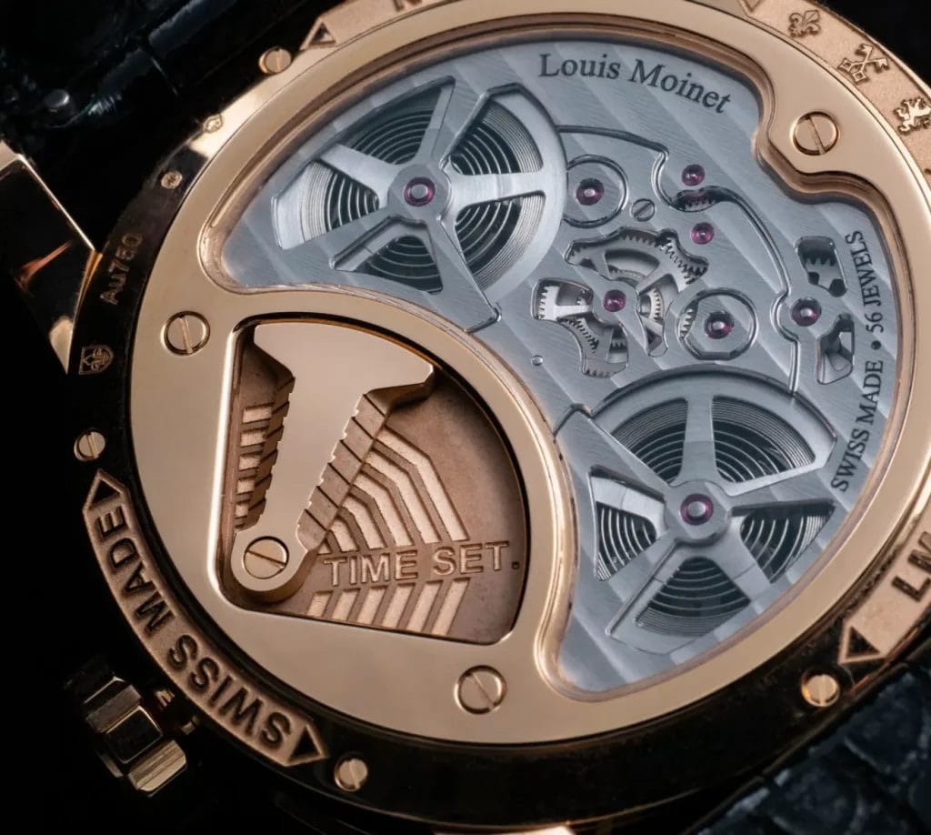 Le verso de l’ASTRONEF est tout aussi impressionnant. À travers un fond ajouré, on découvre les deux barillets, chacun dédié à son tourbillon. Le calibre LM 105, fort de ses 16 roulements à billes en céramique, dirige cette symphonie mécanique, fruit de plus de trois années de recherche intensive.