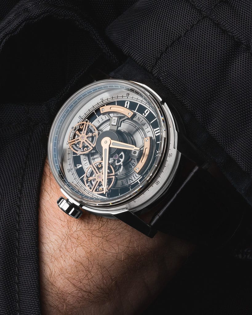 Le verso de l’ASTRONEF est tout aussi impressionnant. À travers un fond ajouré, on découvre les deux barillets, chacun dédié à son tourbillon. Le calibre LM 105, fort de ses 16 roulements à billes en céramique, dirige cette symphonie mécanique, fruit de plus de trois années de recherche intensive.