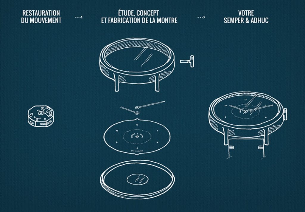 Il n’en fallait pas plus à Colin pour rêver d’une série de montres Semper & Adhuc équipées de ces mouvements si particuliers. Des montres hybrides mêlant passé et présent, ADN de la Maison LIP et ADN de Semper & Adhuc, héritage et perspectives. C’est avec cette idée en tête, telle un lien de filiation auto-proclamée, que Colin de Tonnac a approché Pierre-Alain Bérard, actuel dirigeant de la maison LIP, qui a tout de suite accepté sa proposition. S’est ensuivi un fructueux échange tout au long du développement du projet, afin d’aboutir à la montre que nous vous présentons aujourd’hui.
