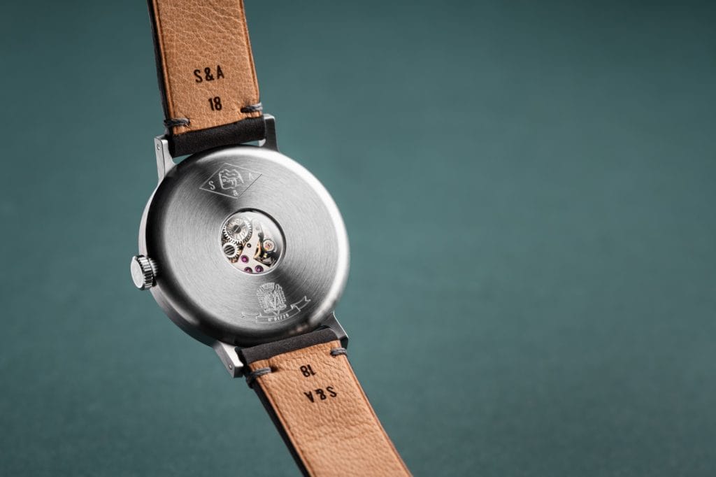Au dos de la montre, en dessous de l’œilleton de fond qui laisse entrevoir le mouvement R100, on retrouve le logo, longtemps apposé par la maison LIP, de l’aigle aux deux colonnes symbolisant Besançon, et paré de deux aiguilles comme hommage à la tradition horlogère de la ville. Avec L’Instantanée LIP par S&A, Semper & Adhuc se rapproche de plus en plus de son objectif d’une montre 100% française, puisque le boitier, le mouvement, le cadran, les aiguilles, le bracelet et l’écrin sont conçus et fabriqués icimême, en France.