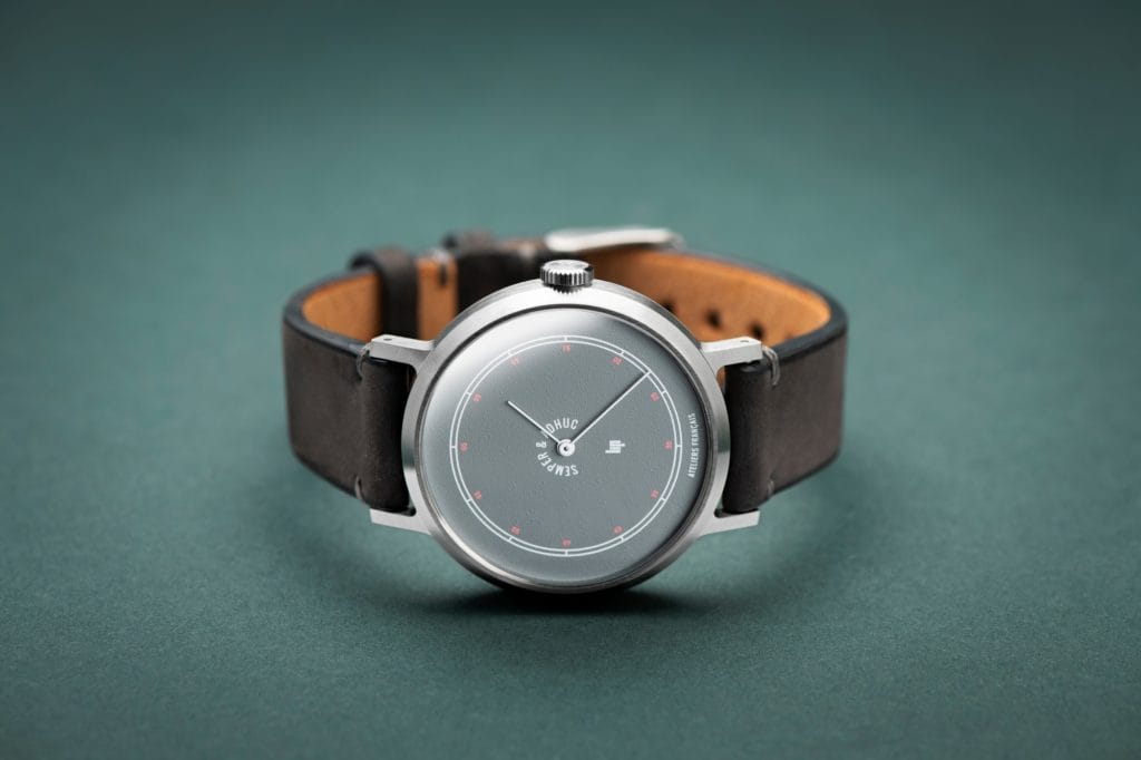 En plus de la double signature, on retrouve sur le bas du cadran la mention « Atelier français » chère à Semper & Adhuc qui, pour l’occasion, s’est dotée d’un « s » supplémentaire, faisant écho à cette collaboration horlogère à cheval entre deux générations, et rappelant au passage que, depuis 2015, LIP a retrouvé la ville qui l’a vu naître en rapatriant ses ateliers à Besançon.