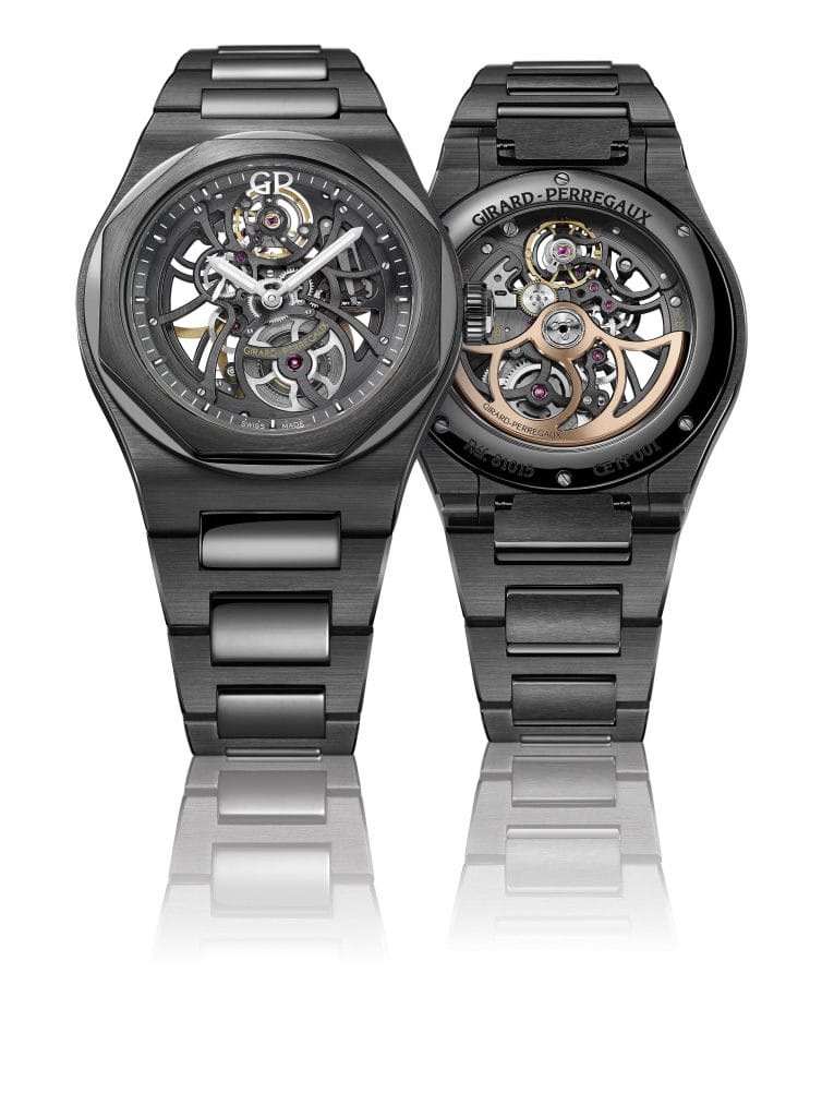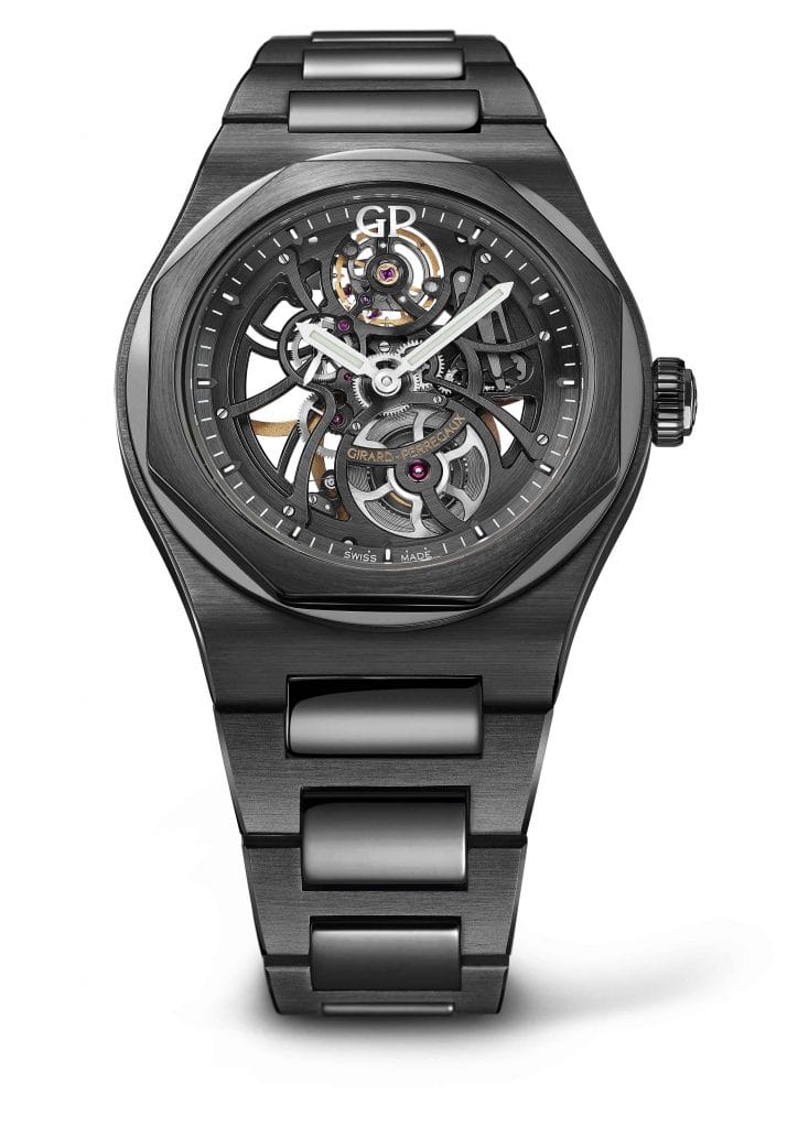 Girard-Perregaux installe son emblématique Laureato Skeleton dans l’univers de la céramique. Ainsi habillée, la montre squelette et sport chic de Girard-Perregaux entre de plain-pied dans l’univers du noir…tout en préservant sa part de transparence. Si elle bascule du côté obscur, et seulement pour gagner encore en charisme et en présence, elle laisse toujours la lumière traverser son exceptionnel calibre ajouré. Ainsi, la Laureato Skeleton Ceramic démontre à nouveau la force et la pertinence du design de Girard- Perregaux, capable de muter à travers le temps, les formats et les matières.