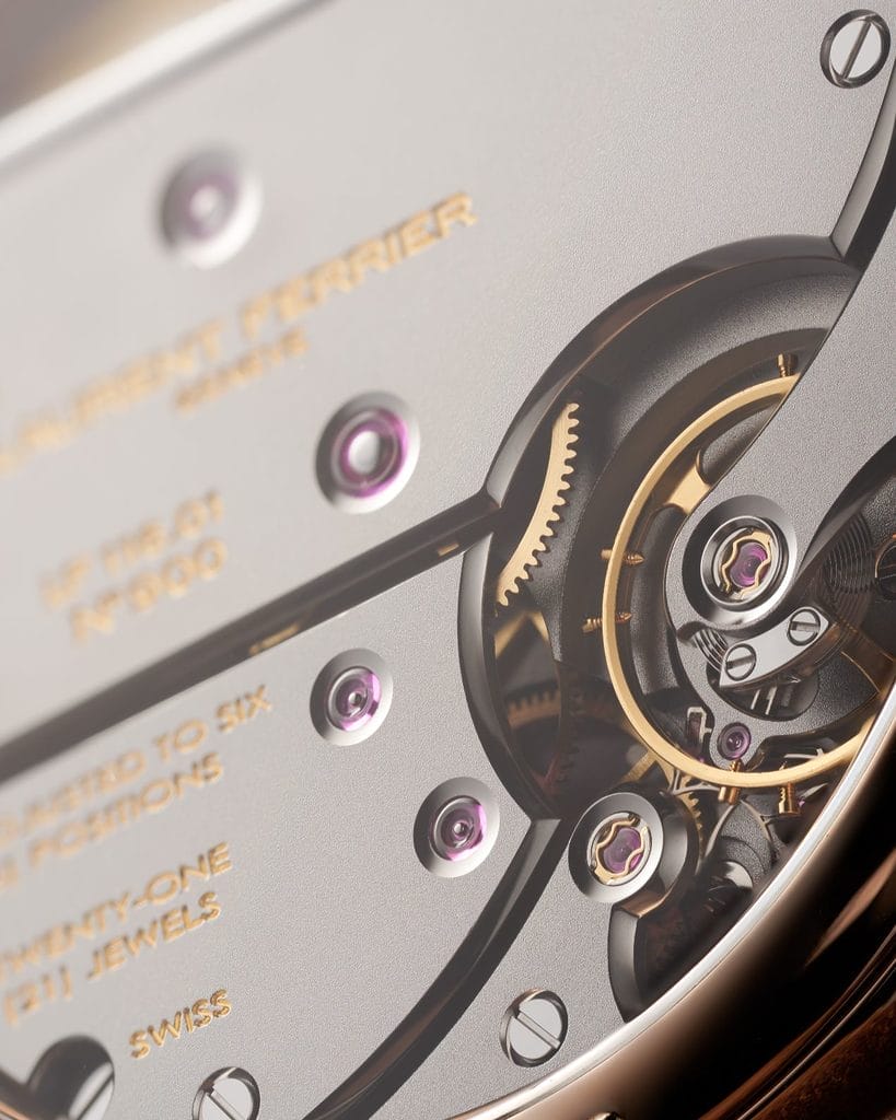 Les surfaces d’acier, quant à elles, se voient noirci-polies, technique où le poli est poussé à un tel degré que la lumière se reflète en un aplat sombre. Même les parties peu visibles bénéficient de ce traitement, preuve que l’exigence de Laurent Ferrier ne se limite pas à ce que l’œil perçoit au premier regard. Chaque composant est ainsi terminé à la main par l’atelier, dans le respect des codes les plus stricts de la haute horlogerie traditionnelle.