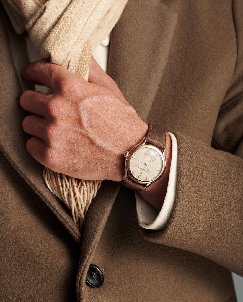 La montre est complétée par un bracelet en nubuck moka cousu main, doublé d’Alcantara ton sur ton. Sa souplesse et son fini mat répondent parfaitement au boîtier poli : la brillance du métal est tempérée par la douceur du cuir, renforçant cette impression d’équilibre qui caractérise la pièce.