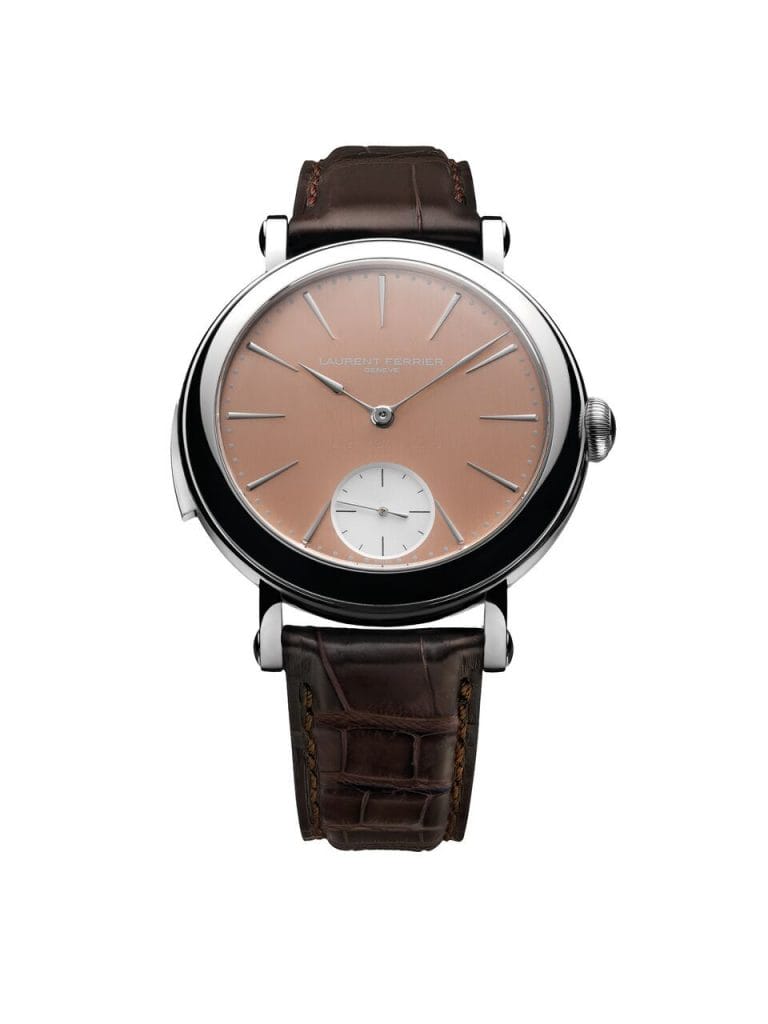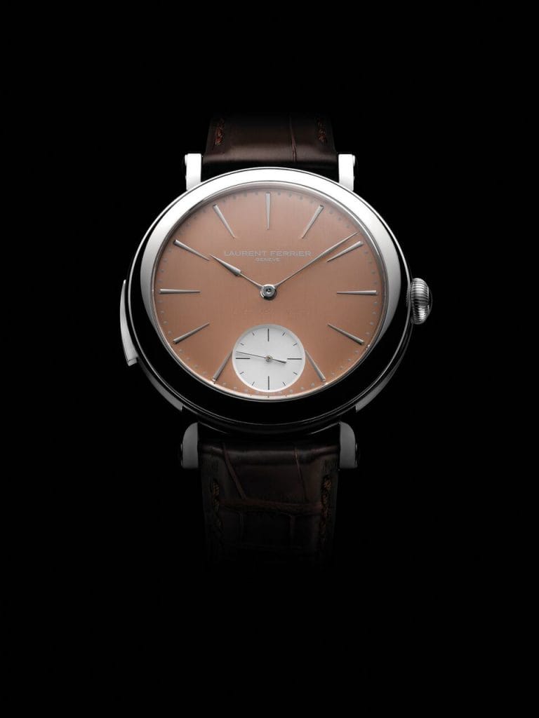 Les aiguilles « sagaie » et « bâton » gardent leur forme si caractéristique. Le cadran se pare d’une teinte or rouge 6N, aux reflets cuivrés, grâce à une terminaison satiné vertical chère à Laurent Ferrier. La petite seconde argentée sous cadran à 6 heures est ornée d’un azurage.