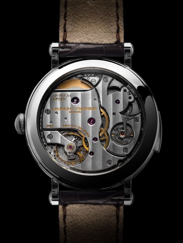 Laurent Ferrier a choisi un mouvement de conception très classique avec un échappement à ancre suisse et des matériaux traditionnels, pour cette complication dont l’originalité réside dans le son cristallin et la longue séquence de sonnerie.