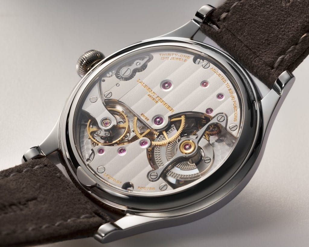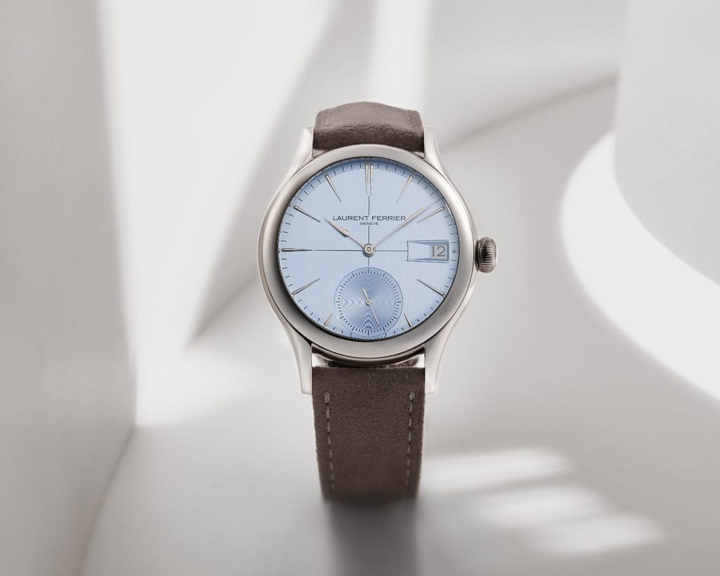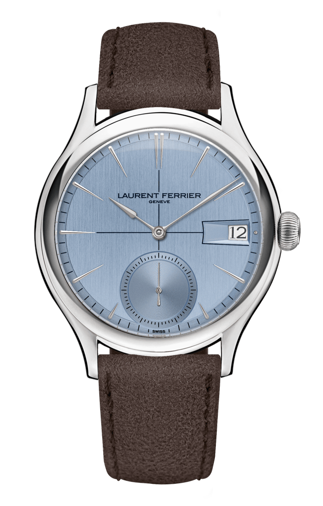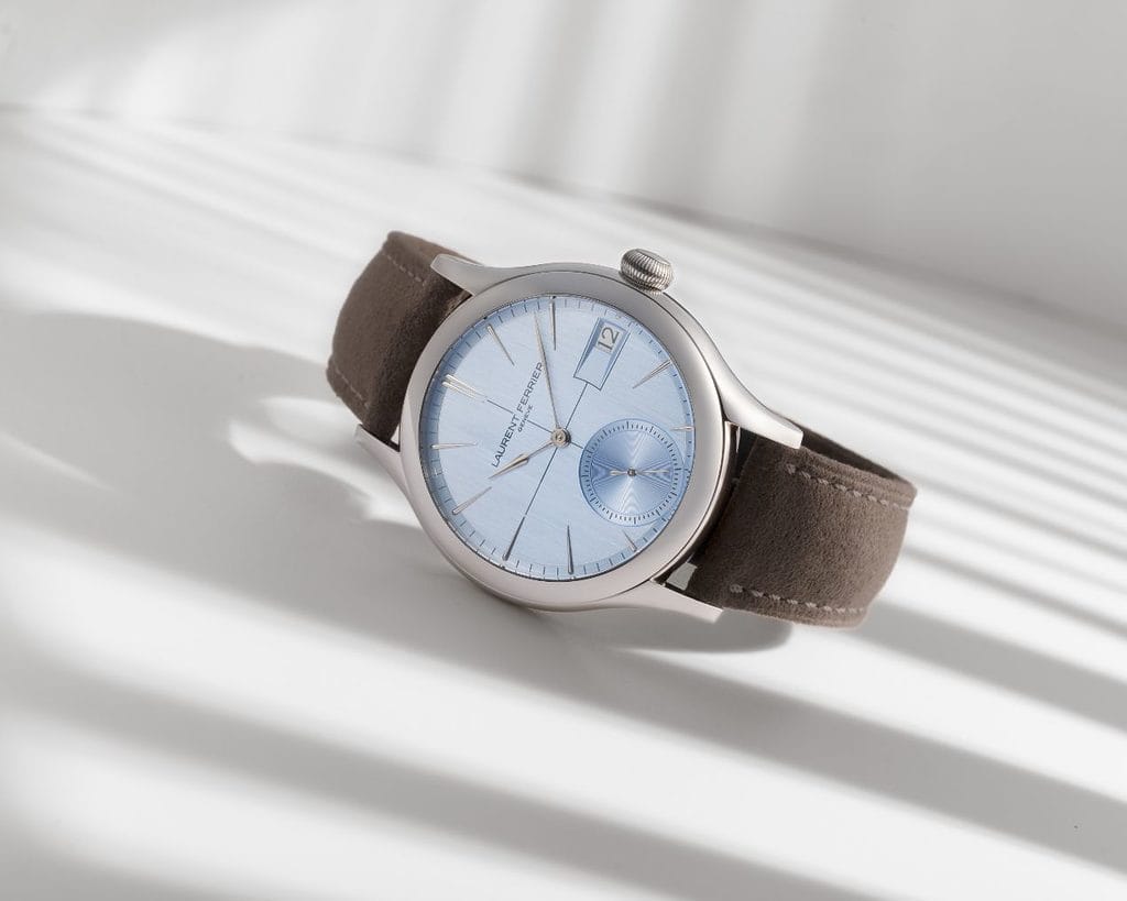 Le bleu horizon du cadran évoque un esprit d’évasion et de sérénité. Selon la lumière, des reflets violets apparaissent, apportant profondeur et subtil clin d’œil à l’esprit créatif de Laurent Ferrier. La laque bleue translucide recouvre une base argentée satinée verticalement au centre et circulairement en périphérie. Les aiguilles sagaies et index en or gris, la petite seconde à 6 heures et le guichet de date à 3 heures complètent l’harmonie.