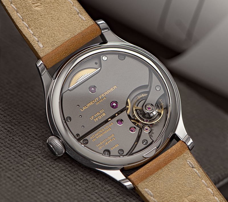 Bien que le calibre LF116.01 soit plus simple que certains mouvements à complications de la Maison, il offre également les finitions luxueuses de toutes les autres créations LAURENT FERRIER. Les ponts sont ornés d’une finition microbillée avec un traitement au rhodium noir et un polissage entièrement manuel des arêtes. Chaque tête de vis est polie miroir et on retrouve un angle rentrant réalisé à la main sur le pont d’échappement, conformément à l’attention minutieuse donnée aux détails par l’ensemble des horlogers de la marque.