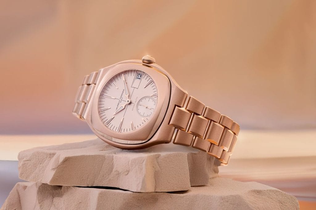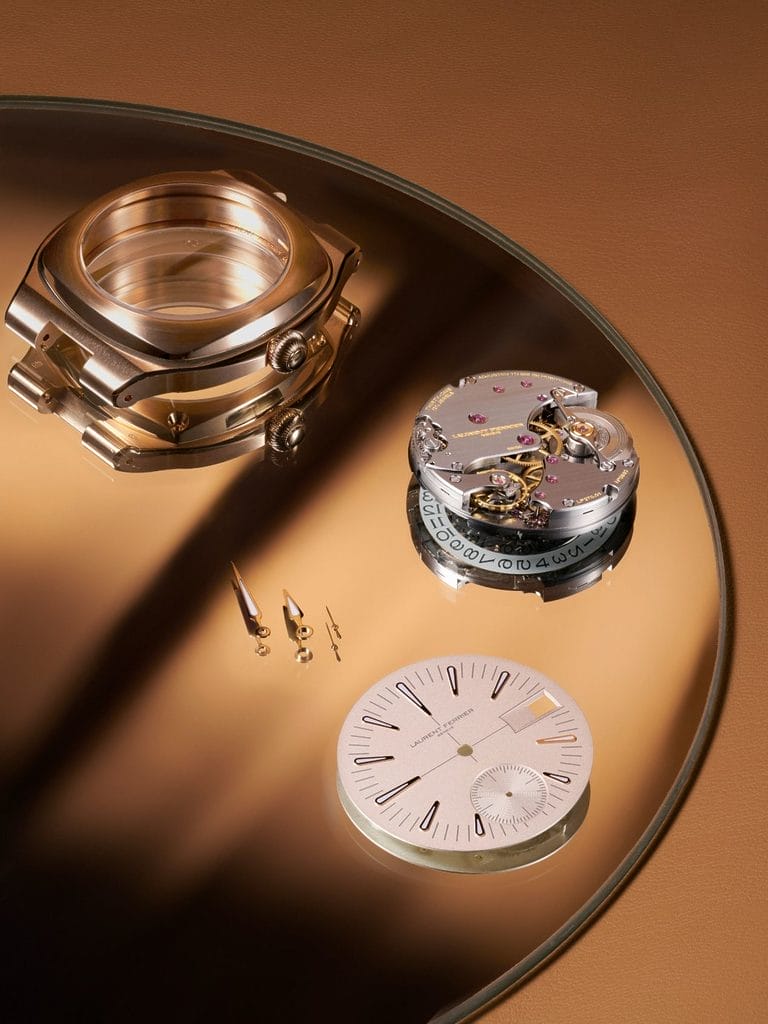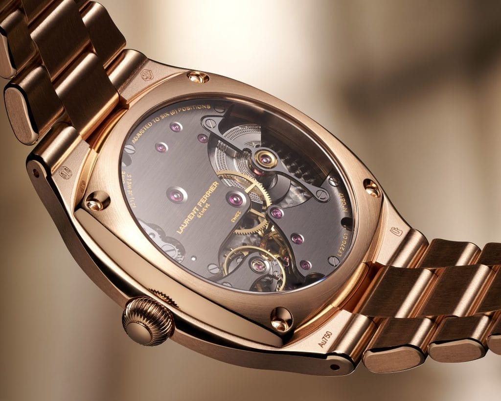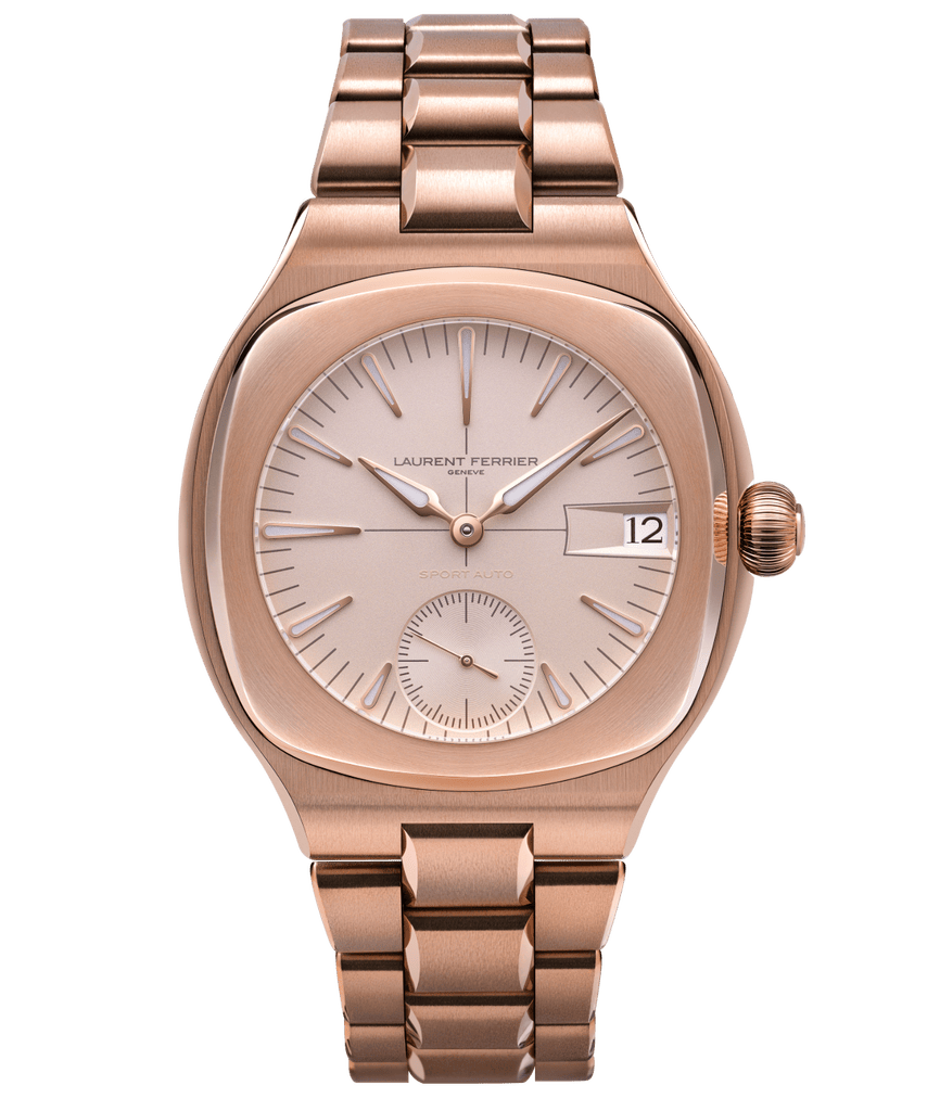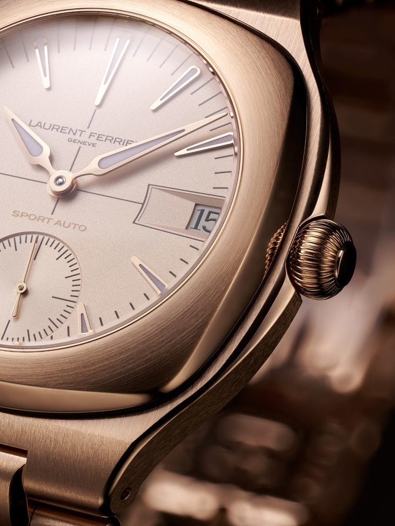 Ce modèle perpétue un souvenir fondateur, cristallisant ce qui fut à la fois un tournant de vie et le passage d’une passion à une autre. Le cadran crème, à la texture poudrée obtenue par un traitement galvanique, exprime la simplicité et l’humilité des deux pilotes. Il rappelle que, comme le dit souvent Laurent Ferrier, ils n’étaient pas champions du monde. Ce fond sobre contraste avec une silhouette habillée d’or rouge, du boîtier jusqu’au bracelet. Chaque courbe rappelle la mémoire de cette course inoubliable, tandis que le métal précieux illustre la véritable récompense : le courage d’oser un nouveau départ.