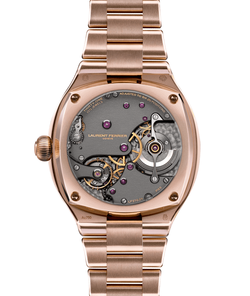 Au cœur de la montre bat le calibre LF270.01, un mouvement automatique à micro-rotor, entièrement conçu, décoré et assemblé à Genève. Inspiré du micro-rotor à échappement naturel, ce mécanisme est animé par une masse oscillante en platine et orné de gravures laser, discrètes allusions à la course de 1979. Le fond en saphir laisse apparaître les finitions soignées : ponts satinés traités au ruthénium, angles polis, décorations manuelles minutieuses sur chaque composant. Le pont de la masse oscillante, par exemple, requiert plusieurs heures de travail artisanal, incluant polissage au bois de gentiane, chanfreins et finition miroir.
