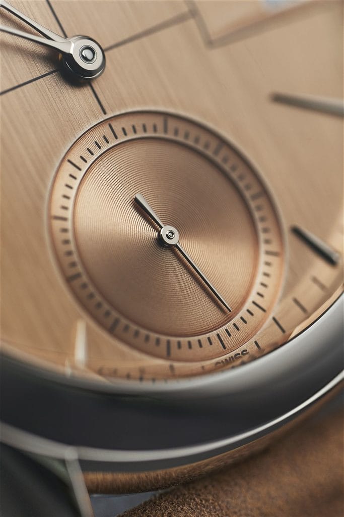 L’élément le plus remarquable est le guichet frappé aux lignes pures et subtiles qui créent une pente douce que les yeux se plaisent à suivre menant naturellement le regard vers l’indication de la date, claire et lisible en gris ardoise sur son disque blanc. Pour renforcer cette ligne et apporter un certain dynamisme à cette pièce à la fois élégante et désinvolte, le guichet est finement encadré de gris ardoise. Le cadran est également marqué d’une croix centrale assortie pour marquer vigoureusement la place triomphante des aiguilles sagaies, en or gris frappé. La petite seconde, en retrait à 6h, est azurée et ponctuée de marqueurs gris ardoise et d’une aiguille bâton.