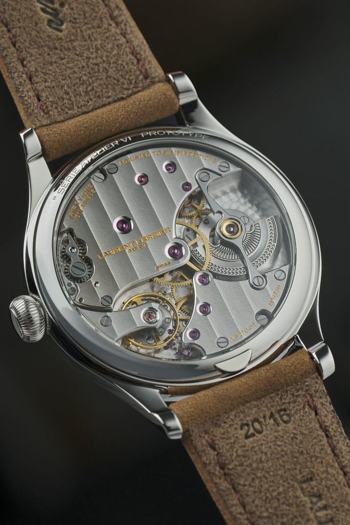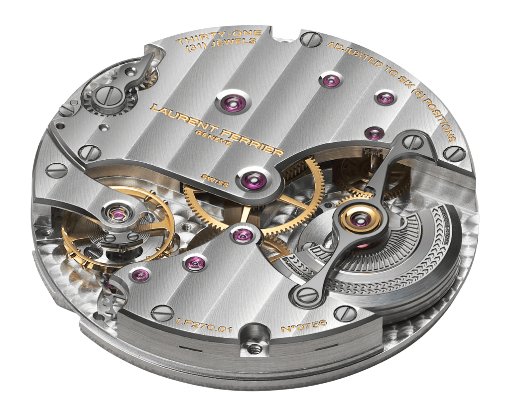 Chaque calibre LF 270.01 nécessite à lui seul plus de 139 opérations manuelles de finition. Ce même pont de masse précédemment évoqué fait notamment l’objet de multiples terminaisons réalisées à la main : les angles sont adoucis puis terminés à la gentiane et à la diamantine, tandis que la surface est polie miroir. En outre, le mouvement présente quelques angles rentrants, de multiples surfaces polies au zinc et de nombreux satinages et perlages, le tout exécuté à la main, dans les ateliers LAURENT FERRIER. Les côtes de Genève rhodiées sur l’ensemble des ponts viennent apporter la touche finale à ce calibre d’exception.