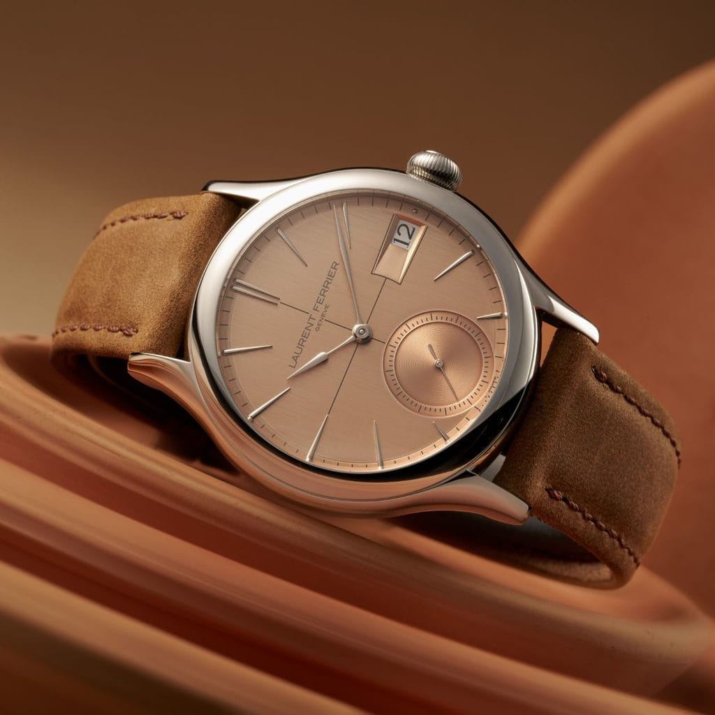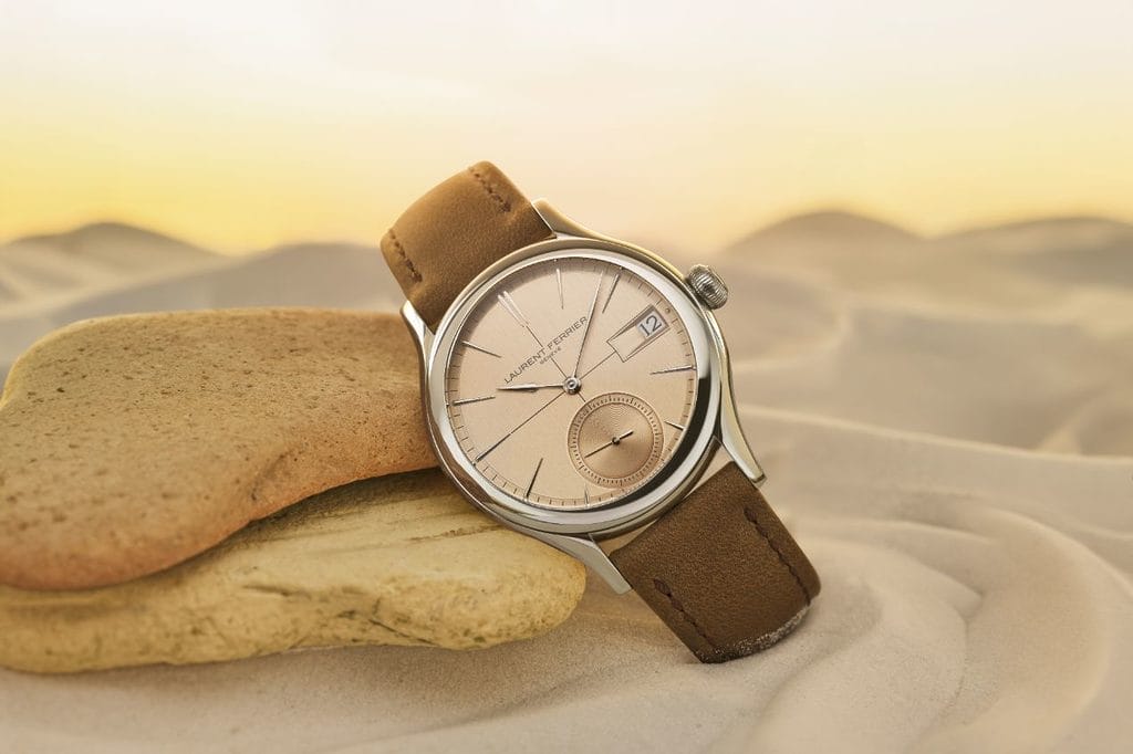 Un cadran rosé rappelle les nuances chaleureusement vintage des montres du siècle dernier. Il intègre une touche de modernité grâce à des teintes neutres et dynamiques comme le sable et la terre. Ces nuances terreuses et cuivrées s’affirment et se fondent tout en discrétion révélant un esprit subtil mais assumé. Ces tons neutres sont intrinsèquement liés à la nature et à la terre elle-même, symbolisant ainsi une sensation de stabilité et de sérénité. Psychologiquement, les teintes de sable et de terre sont perçues comme apaisantes et équilibrantes, loin d’être flamboyantes elles sont discrètes et constantes, ce qui encourage un caractère affirmé et ancré dans le moment présent. C’est un rappel subtil de la beauté de la nature et de la continuité du temps, un hommage à l’héritage de LAURENT FERRIER.