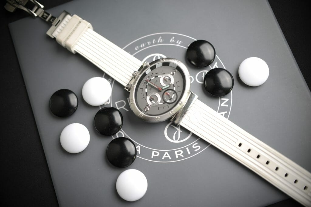 Équipé d’un mouvement Sea-Gull, ce Chronographe est dessiné comme le tableau de bord d’une voiture de course avec ses trois cadrans traversés par un anneau en damier. La boîte, de forme elliptique, a la rondeur et la sensualité d’une pierre du jeu de Go. Performance, précision et stratégie se retrouvent donc dans ce cadran qui ravira les amateurs plus conservateurs de pièces d’horlogerie.
