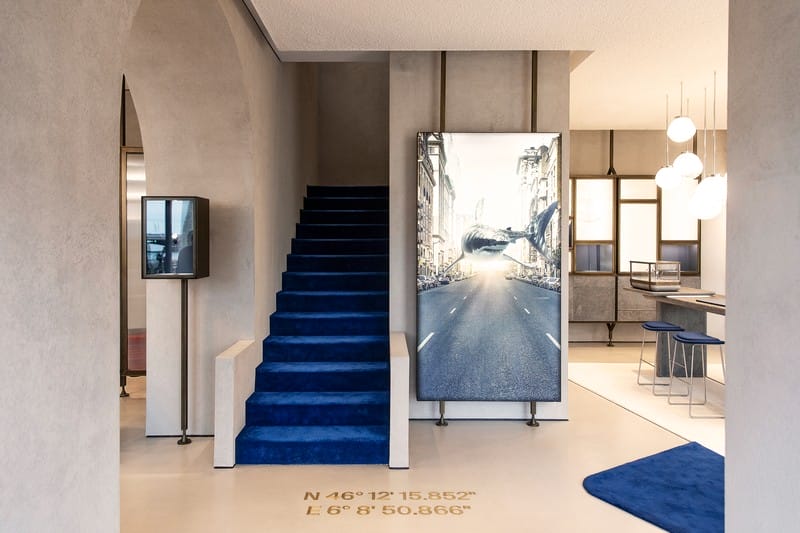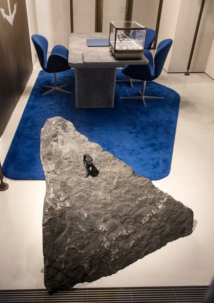 Jouant la carte du contemporain et du naturel avec des matériaux nobles, bruts, patinés ou brossés, sur lesquels le temps peut laisser une trace, Ulysse Nardin obtient un audacieux contraste avec les façades du bâtiment historique. Clin d’œil à l’horloger des océans, des comptoirs de présentation en pierre brute (un composite minéral par endroit lisse ou texturé) tels des rochers immergés, des luminaires translucides et uniques soufflés en verre de Murano et suspendus comme des gouttes d’eau qui tomberaient du ciel, des vitrines d’expositions et paravents évoquant l’air et l’horizon, des touches de bleu qui viennent faire écho au « bleu Ulysse Nardin » et par extension au bleu de la mer et, enfin, le bois en chêne couleur sable qui réconcilie surface, profondeur et rivage… Tout nous plonge sous et sur l’eau, dans une ambiance chic et zen. Le design est vibrant, tout en contraste de couleurs et de densité. La mer et l’eau sous toutes ses formes s’invitent très largement dans la boutique, dans un ballet de transparence et de lumière. Le mouvement, les réflexions de la lumière et le contraste transparence/opacité ont été travaillés pour donner une impression de légèreté et d’élégance. Un grand plongeon où le temps est suspendu.