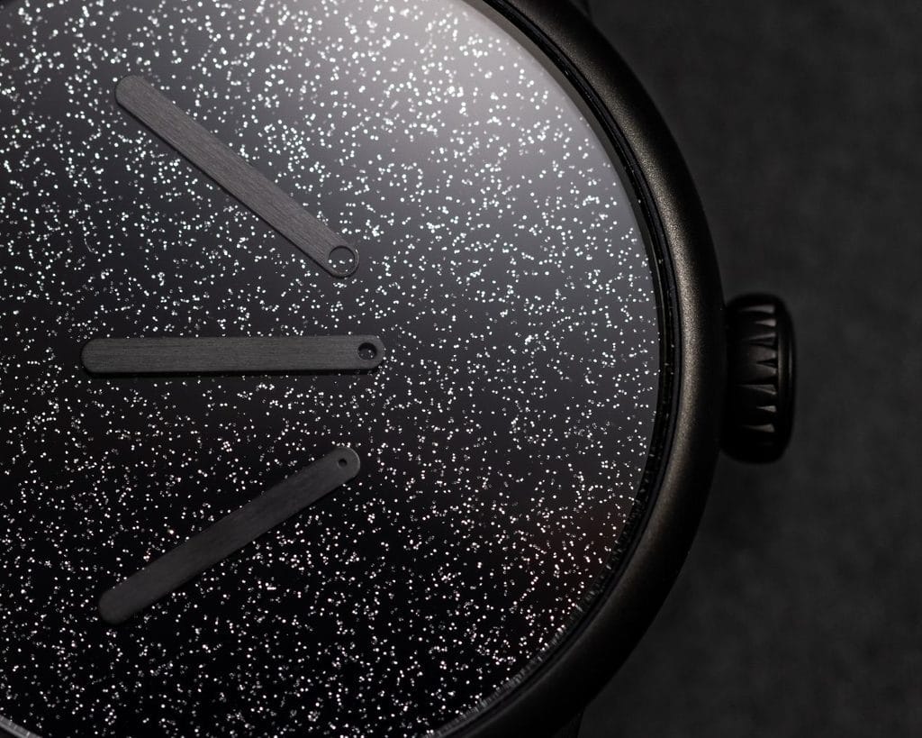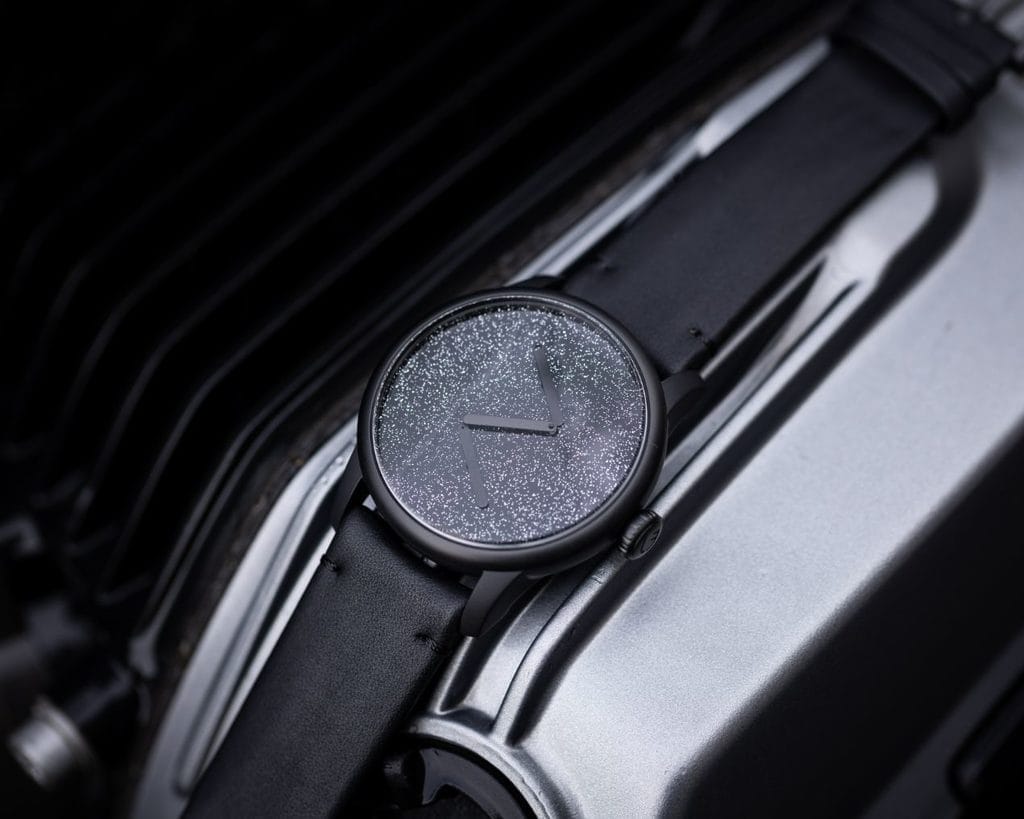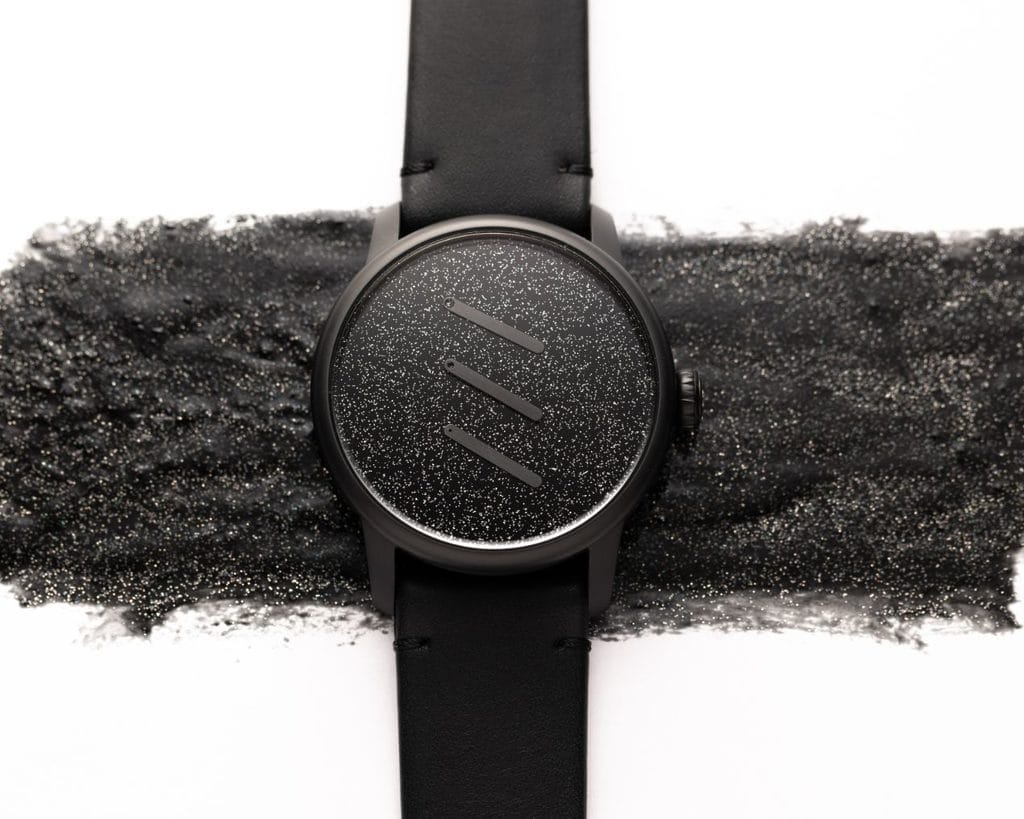 Cette montre est une frontière. D’un côté le pays des signes, de l’autre celui de l’horlogerie. Cette montre invite à traverser cette frontière, c’est un voyage. Normal, Olivier Mosset ne fait pas que de l’art, il est aussi biker. Easy Rider dans le Jura. Un artiste dans le « Watchland ». Tout est noir, boite, bracelet, aiguille. Une œuvre pure, sans inscription, sans logo. Seul le cadran contraste, semé de paillettes argentées. Les aiguilles sont des bâtons, heure, minute, seconde, trois fois les mêmes, même longueur, même largeur, mêmes arrondis aux extrémités. À un détail près : la taille du trou qui en indique le sens, indication minimaliste, juste de quoi ne pas perdre complètement le sens de lecture.