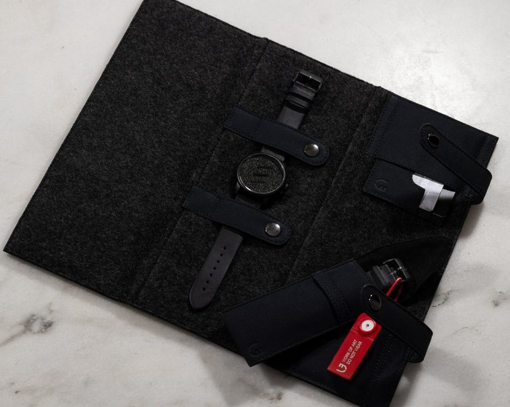 Les codes de l’artiste ont été traduits en design pour les faire tenir dans l’espace de la montre. Réduction géométrique. Réduction chromatique. Des aplats. Tout est là. Puis vient le cadran, qui reprend un autre pan de l’œuvre d’Olivier Mosset. L’artiste aime la culture de la route, motos, voitures, qui ont leur place dans son travail artistique, customisées, mises en scène, comme des sculptures. La montre reprend l’esprit de ces carrosseries, avec son cadran peinture métallisée, noir et paillettes.