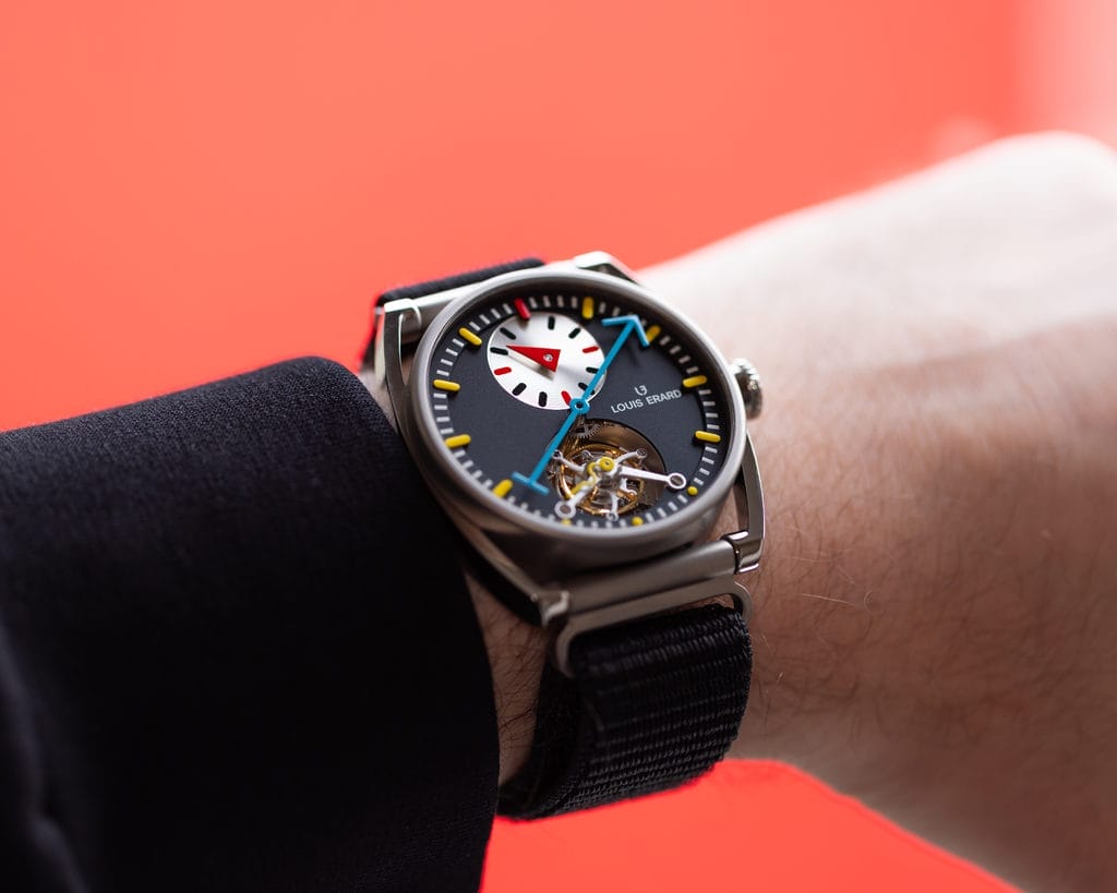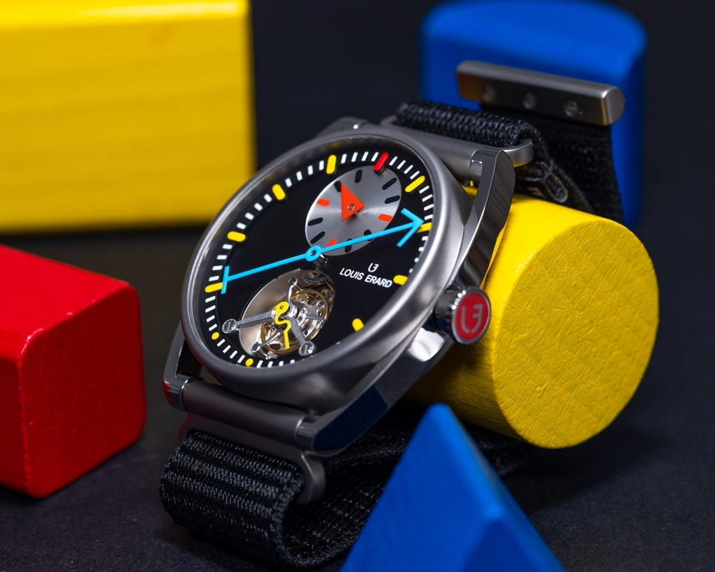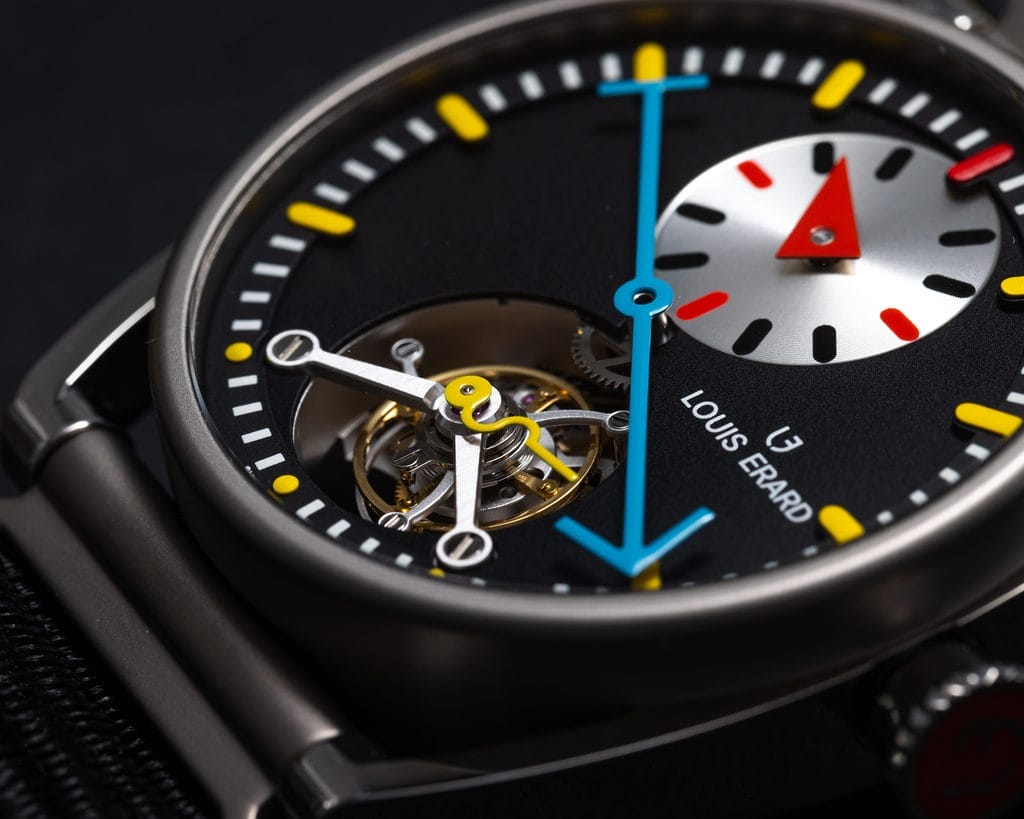 Encore quelques mots. Le fabricant du tourbillon, Olivier Mory, est une personnalité discrète, mais unique dans le paysage horloger suisse. Il s’est formé dans le calibre de grand volume, chez Sellita, avant de s’intéresser à la haute horlogerie, chez ValFleurier, puis de faire le pont entre les deux mondes, rendant, lui aussi, accessible l’inaccessible. Le mouvement qu’il a développé pour Louis Erard témoigne de son talent. Le tourbillon n’est traditionnellement pas couplé au régulateur — signature de Louis Erard depuis sa création en 1929 — même si les deux complications ont la même origine : la chronométrie. Il ne manquait qu’une vision pour rassembler les deux mondes, celle de Manuel Emch, et une mise en scène, laissée à Alain Silberstein. Ils ont déjà eu l’occasion de sceller leur complicité au travers de nombreuses collaborations.