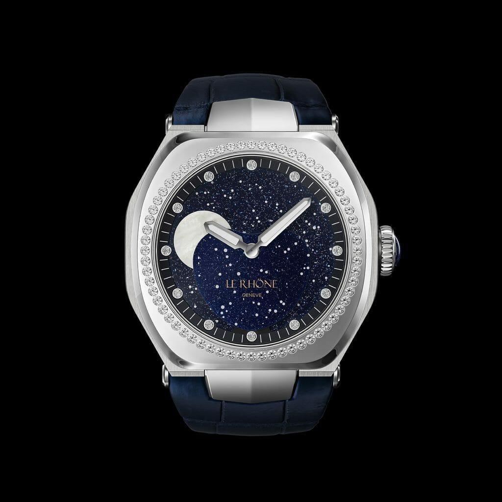 De ce verre d’aventurine bleu foncé, Le Rhöne en a fait un cadran élargi de la Moön 37mm.