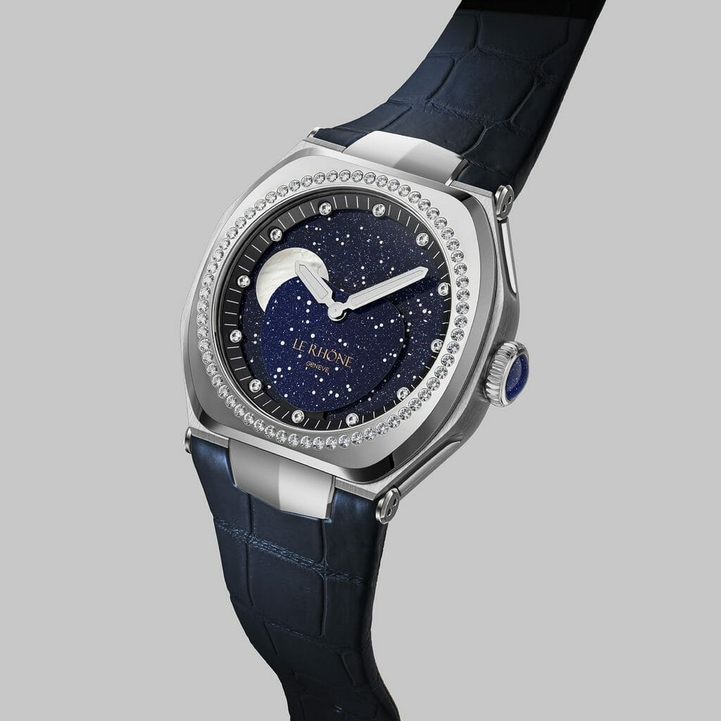La surface de la large lunette bénéficie d’une finition polie à la main jusqu’à ce qu’elle devienne presque un miroir qui reflète parfaitement la lumière. Délicatement et sobrement sertie de 64 diamants, elle réhausse et illumine élégamment l’éclat et la magie de l’ensemble. Et parce que Le Rhöne conçoit ses garde-temps pour une clientèle active, la montre est étanche à 5 ATM qui équivaut à une pression à 50 mètres de profondeur.