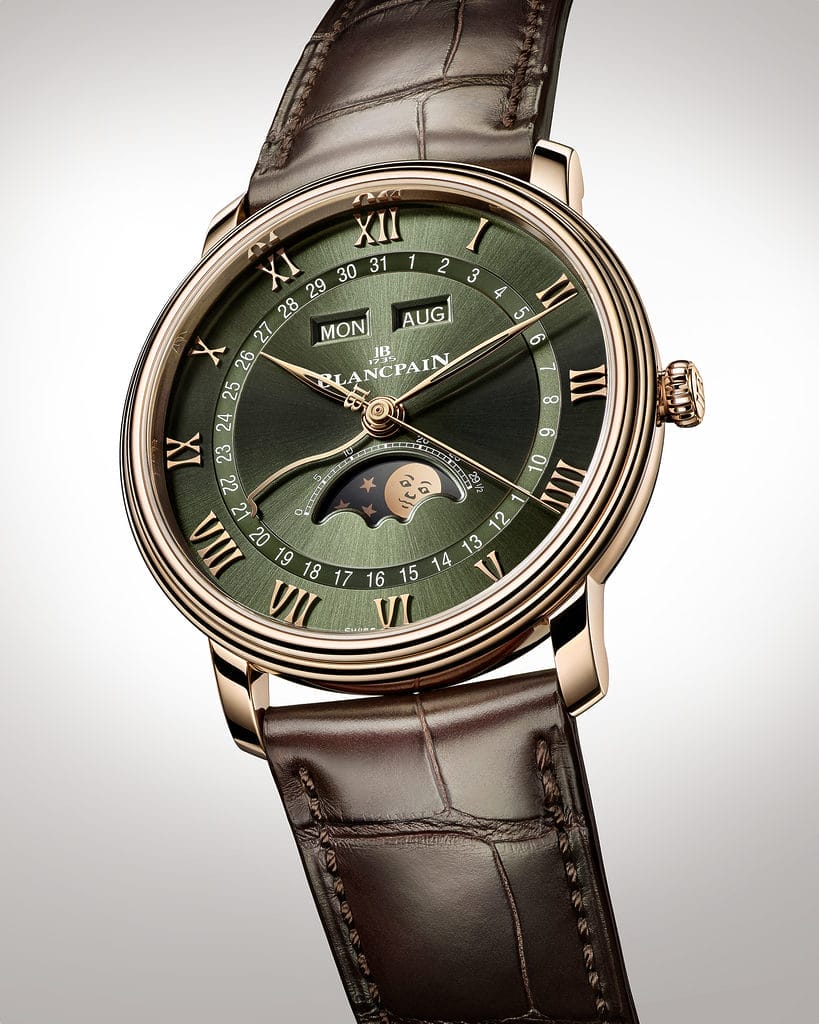 Conjuguant avec harmonie calendrier complet et phases de lune, la Villeret Quantième Complet est une merveille mécanique. Indiquant la date, le jour de la semaine et le mois, à travers un cercle de date et deux guichets dédiés, ce garde-temps de 40 mm en or rouge 18 ct présente des proportions pensées de façon à garantir un équilibre visuel et un confort de lecture optimaux. Le contraste du nouveau cadran à la subtile nuance verte avec les aiguilles et index en or rouge renforce cette facilité de lecture des informations, tout en apportant un caractère chaleureux unique. Et afin de protéger le mécanisme calendaire complexe, le calibre 6654 est sécurisé, permettant au porteur d’ajuster les indications du calendrier quand bon lui semble, à l’aide des correcteurs sous cornes brevetés de Blancpain dont l’utilisation se fait par simple pression du doigt.