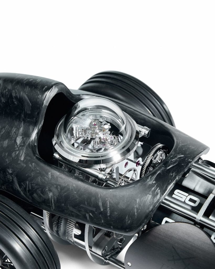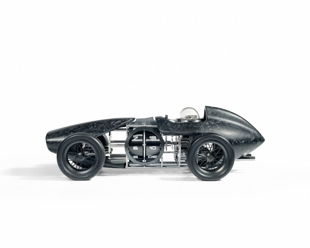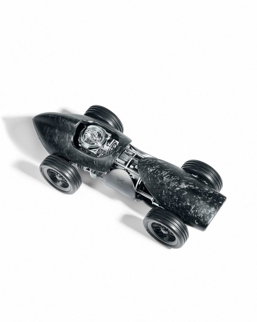 Cette voiture de course une place, au design classique des années 1950, évoque l’âge d’or des sports mécaniques. La Time Fast Forward doit son allure moderne et distinguée aux couleurs sombres de sa carrosserie et à une matière high-tech spécialement conçue pour elle : la fibre de carbone forgée. Son moteur n’est autre qu’un mouvement à plusieurs niveaux et doté d’une réserve de marche de huit jours, qui épouse harmonieusement le volume de la carrosserie. Il se remonte en faisant rouler le véhicule en arrière, tout comme une petite voiture – un clin d’œil attendri à l’âge de l’enfance.