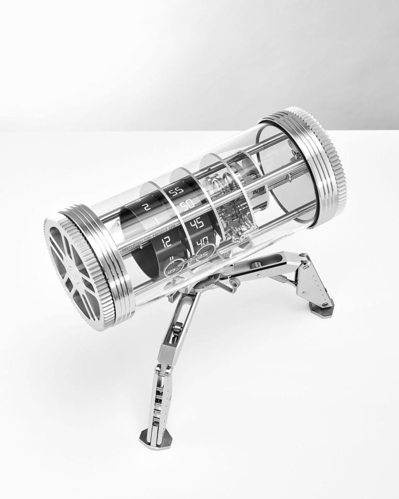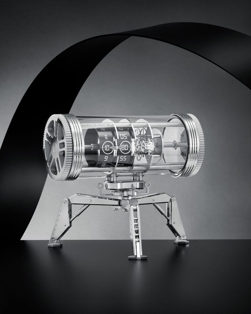 La Time Machine adopte un design toujours plus innovant – en exclusivité pour Bucherer. Cette sculpture mécanique a été imaginée et conçue en s’inspirant de grands classiques de la science-fiction, comme « Retour vers le Futur ». Son allure fascinante est en parfaite adéquation avec l’esprit raffiné de l’horlogerie. La capsule temporelle, un tube de verre contenant l’affichage de l’heure et l’ensemble du mouvement mécanique, se modifie d’une simple rotation. Elle offre également une vue magnifiquement dégagée sur l’ensemble du mécanisme et sa réserve de marche de huit jours. À l’intérieur, deux cylindres en métal noir affichent l’heure. Les roues aux lignes élégantes montées à chacune de ses extrémités permettent de régler l’affichage de l’heure et de remonter le barillet. Par ses détails sophistiqués et ses fonctionnalités élaborées, la Time Machine emporte l’observateur dans un fabuleux voyage à travers le temps, l’occasion de faire l’expérience de toutes les facettes de ce garde-temps fabuleux.