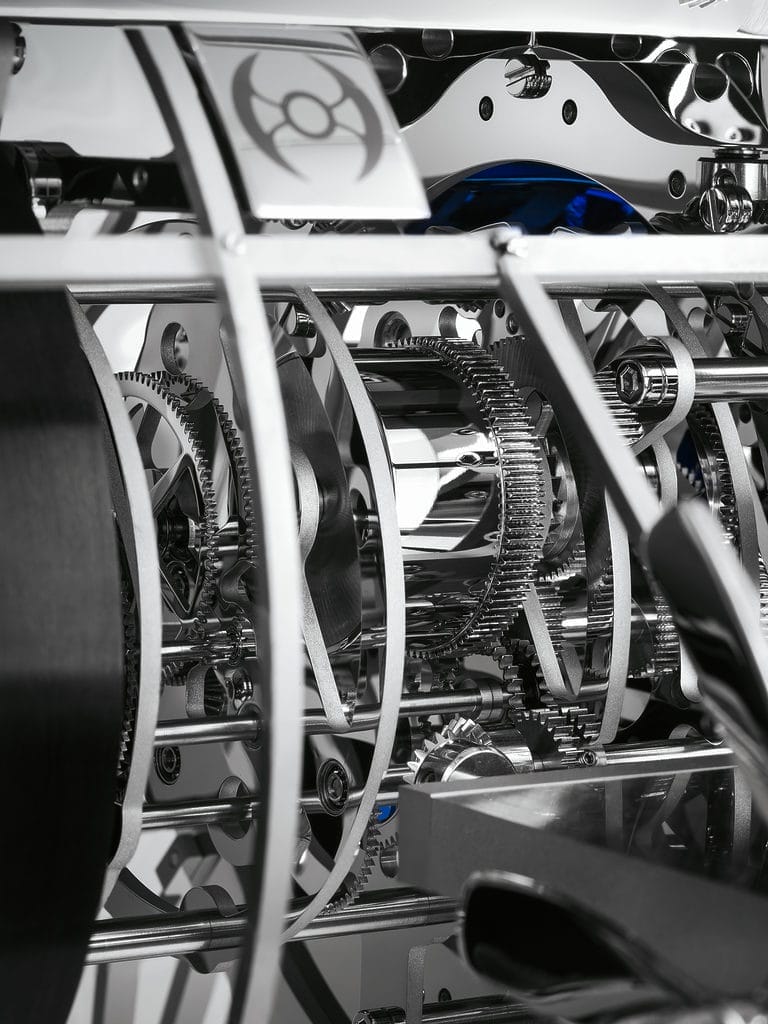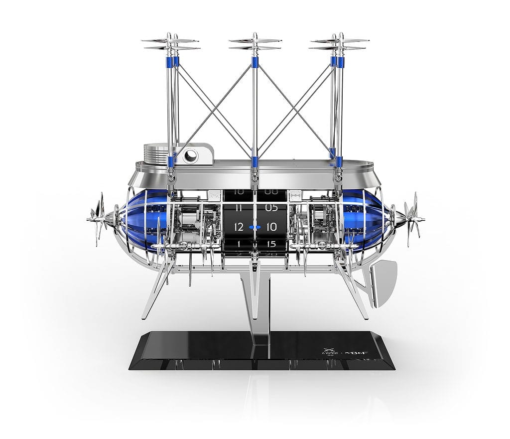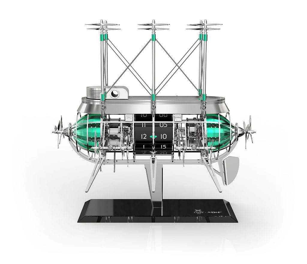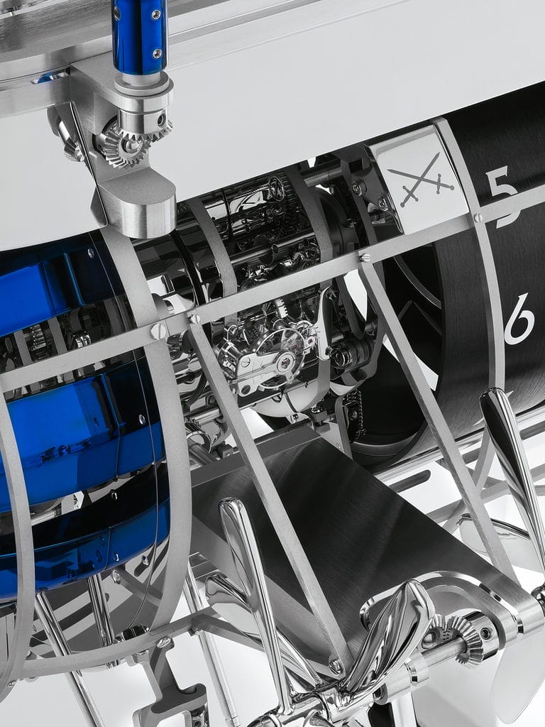 Après 10 ans de collaboration pour 15 horloges, L’Epée 1839 et MB&F présentent l’Albatross, de loin la plus audacieuse au plan technique de toutes leurs co-créations. Avec un total impressionnant de 1520 composants, l’Albatross est dotée d’une sonnerie – qui sonne les heures, avec une frappe pour chaque heure, et les demi-heures, avec une frappe unique – et d’un automate composé de 16 paires d’hélices qui entrent en action à chaque heure.