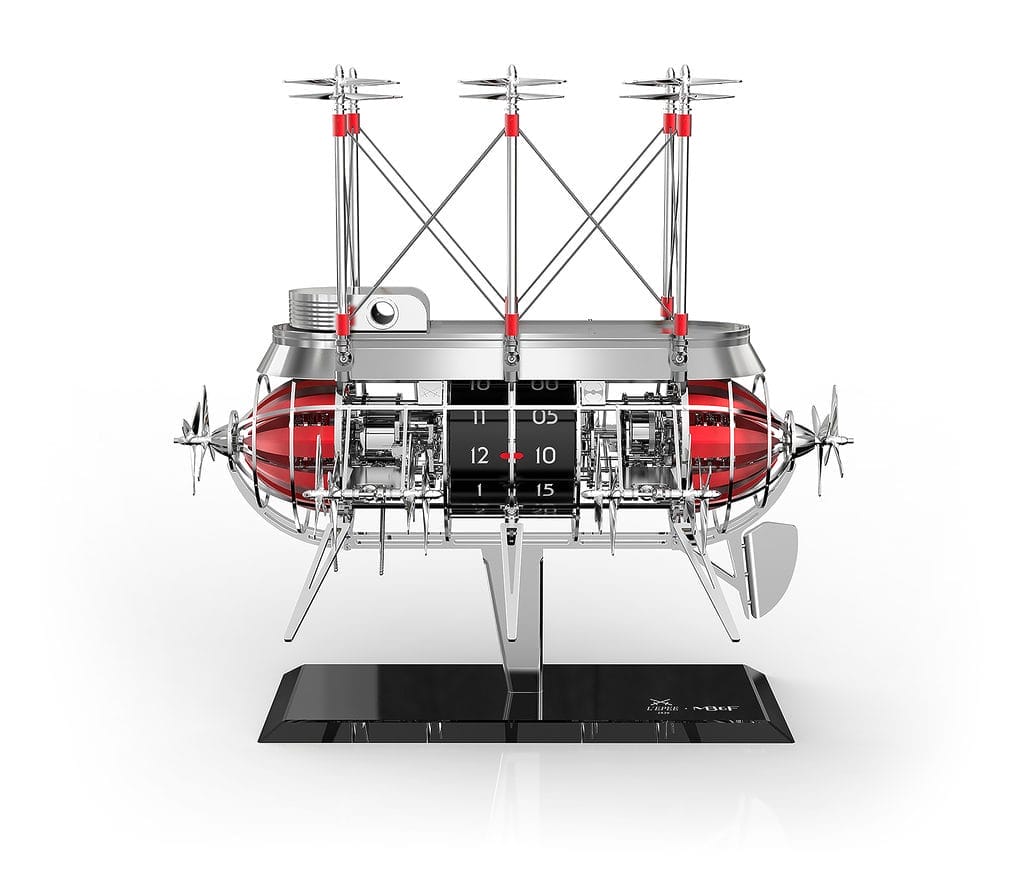 Les caractéristiques techniques de l’horloge sont impressionnantes : 1520 composants, 17 kg, 60 cm de long, 60 cm de haut et 35 cm de large. Quand sonnent les heures, l’aéronef s’anime, comme si elle s’apprêtait à décoller, et ses 32 hélices tournent pendant environ sept secondes.